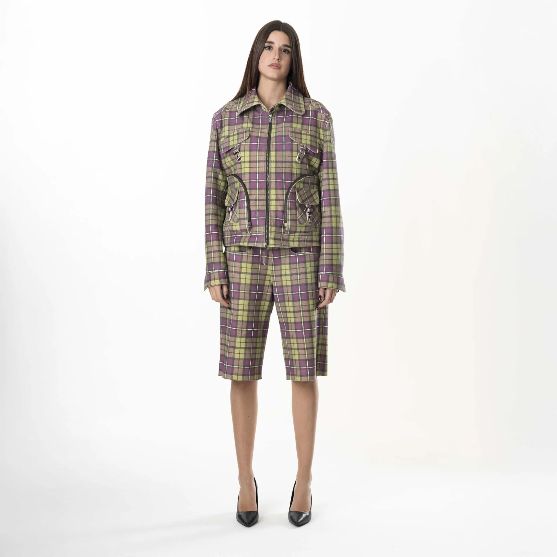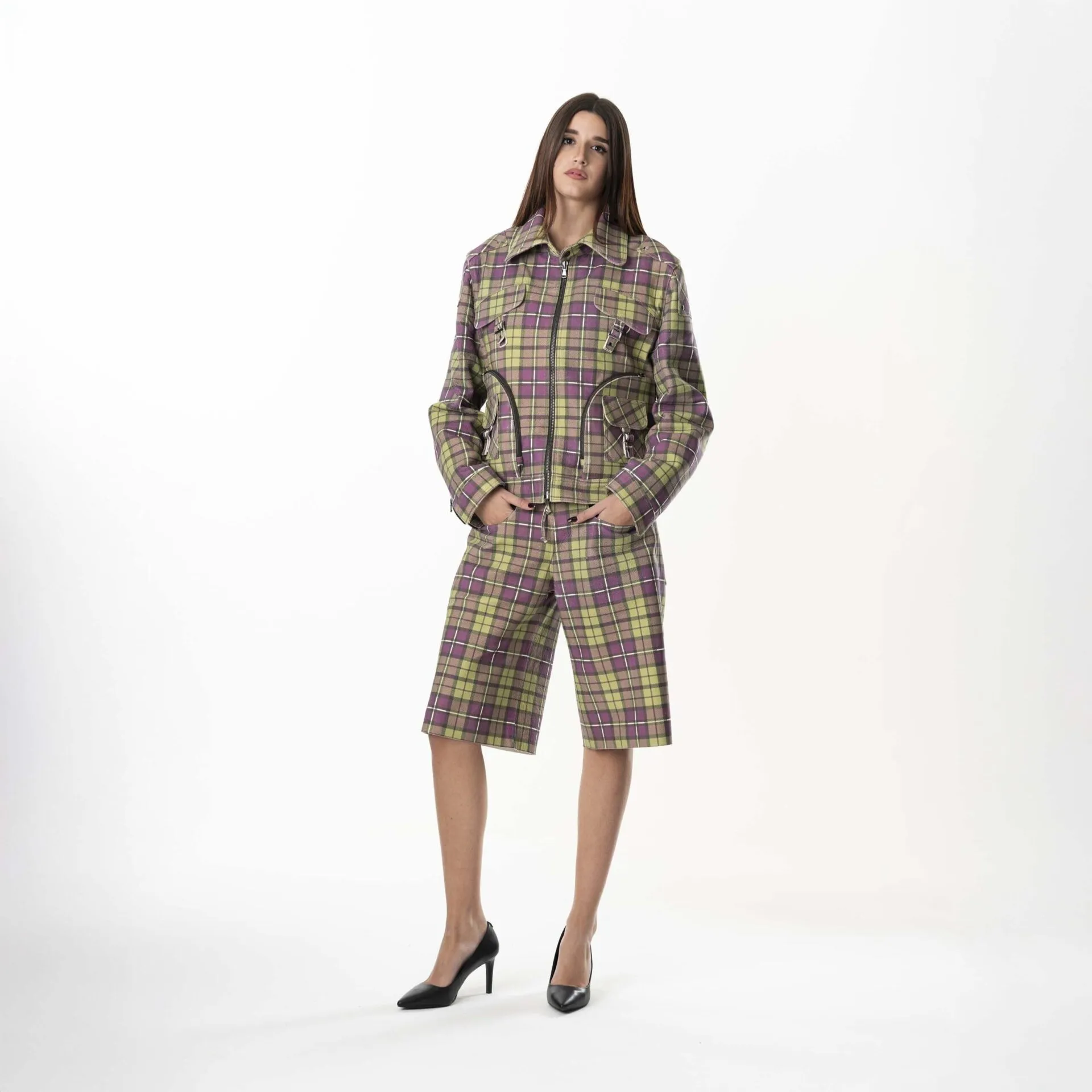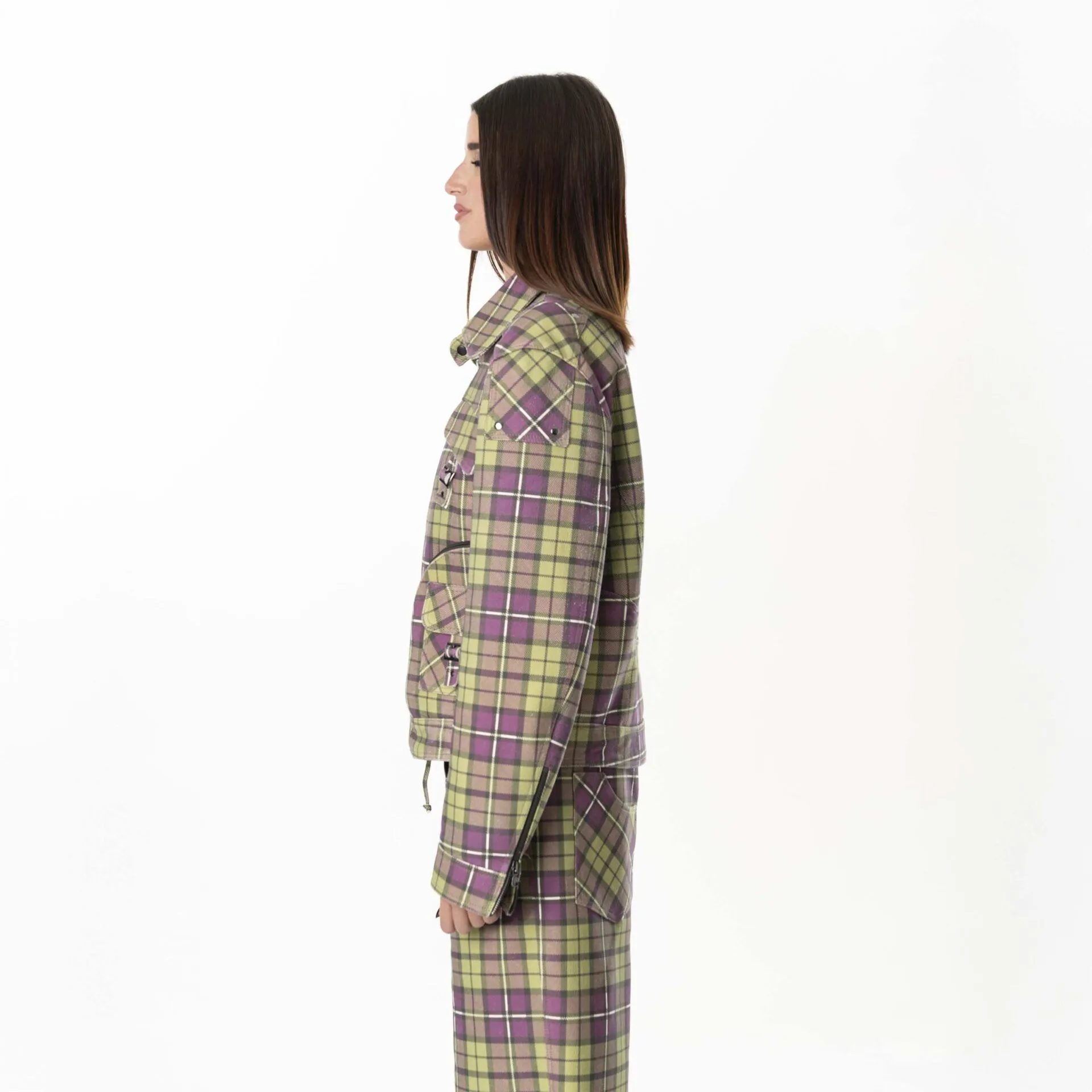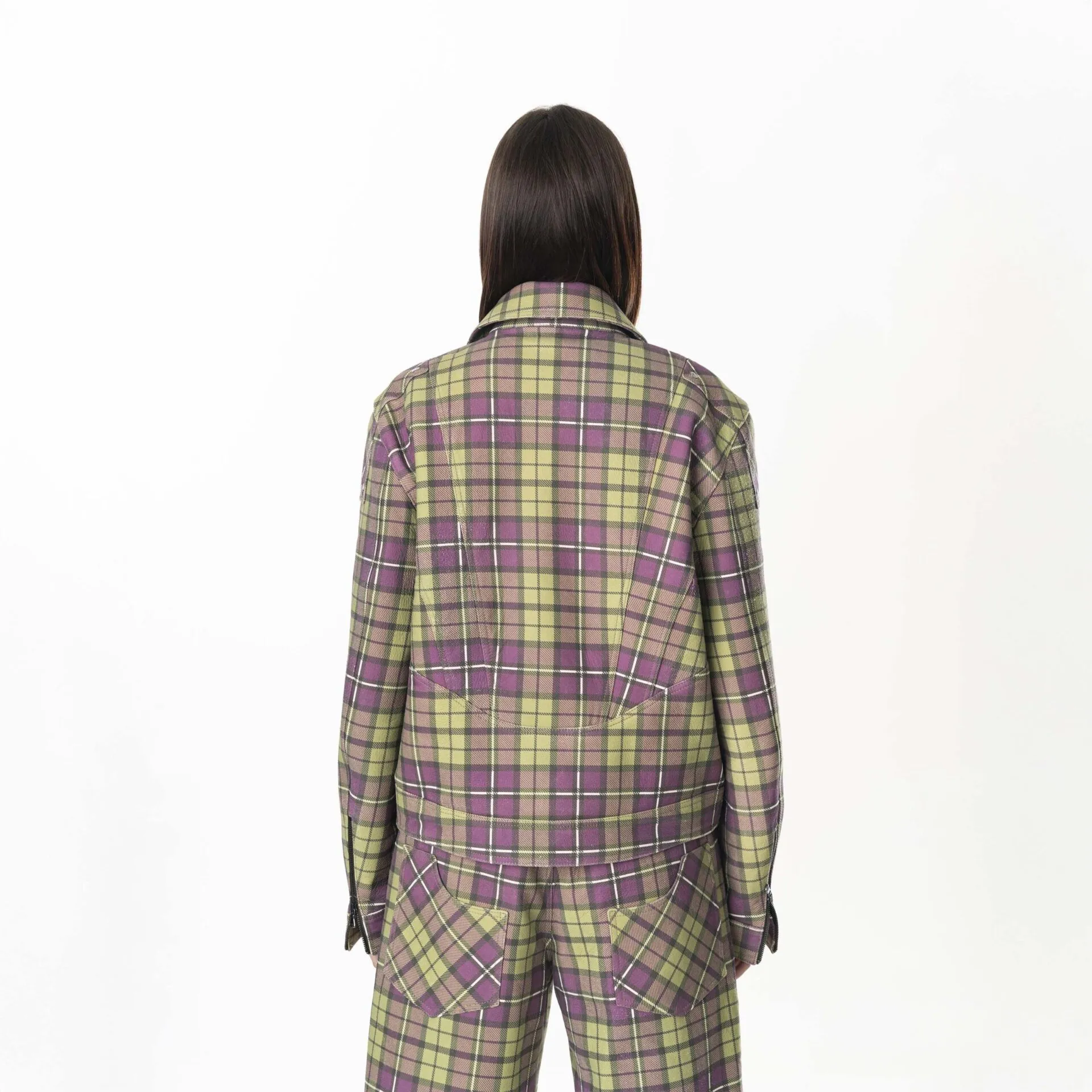 Multizip Leather Tartan Jacket Woman – Purple Green