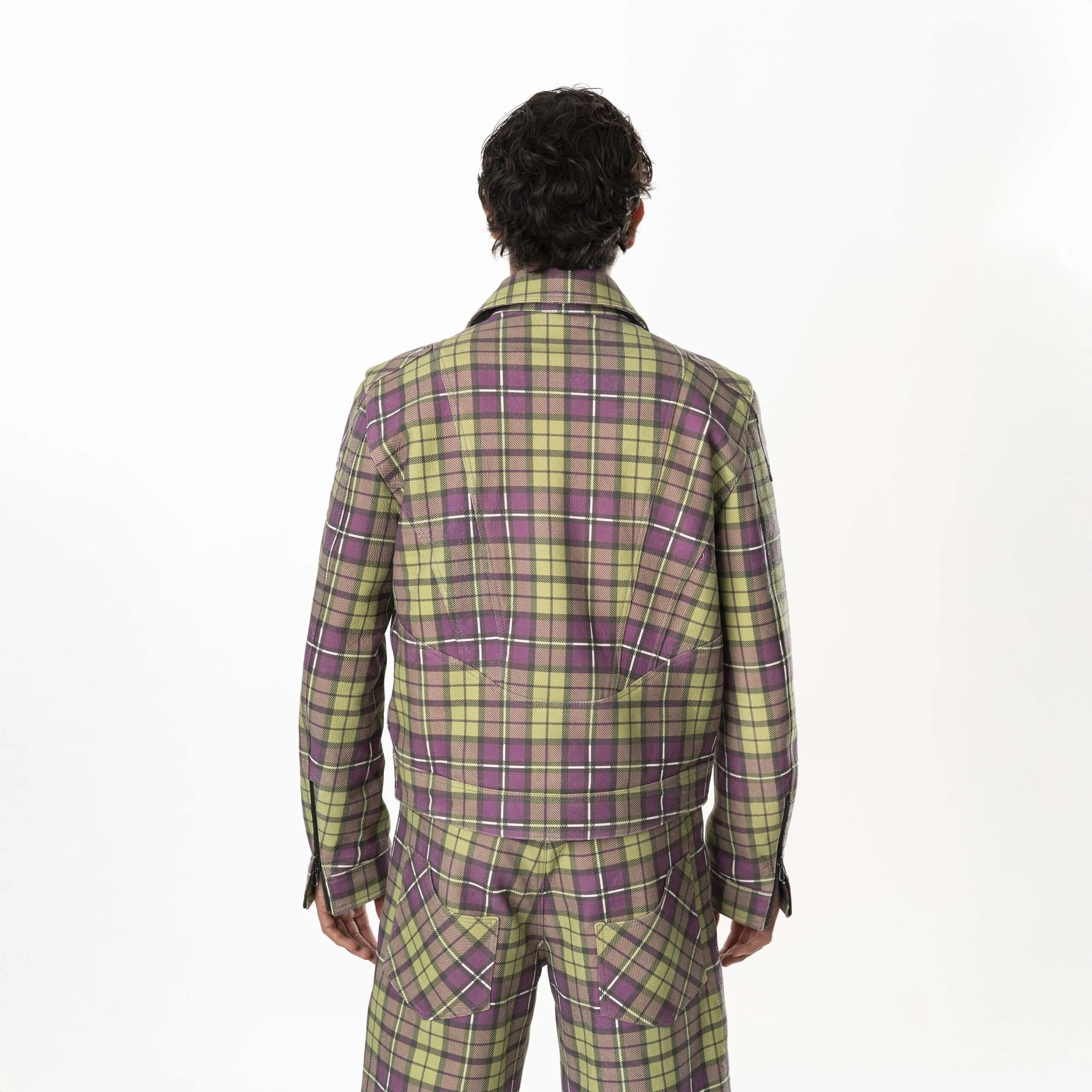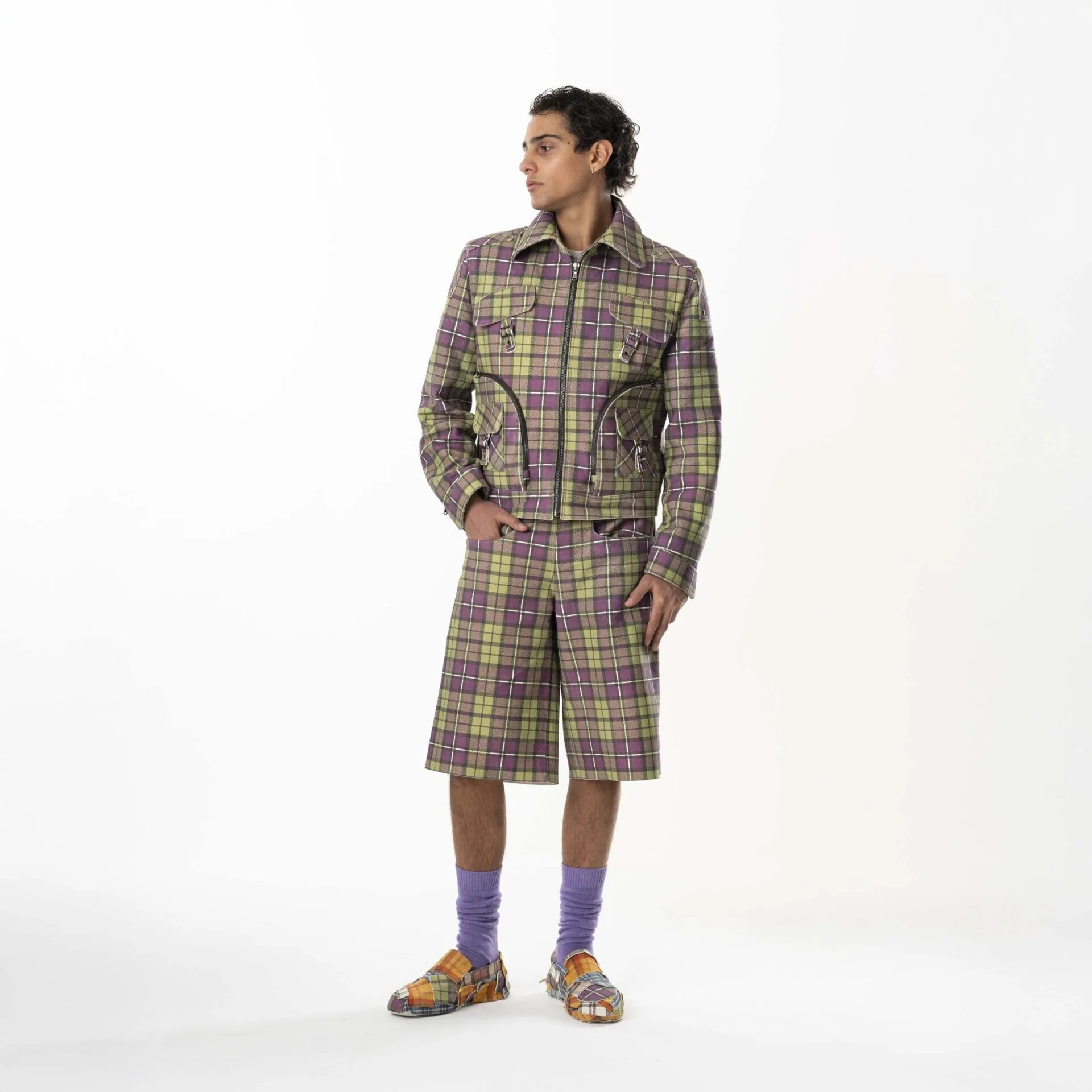 Giacca oversize in pelle tartan | Multitasca con zip circolare fatto a mano in Italia