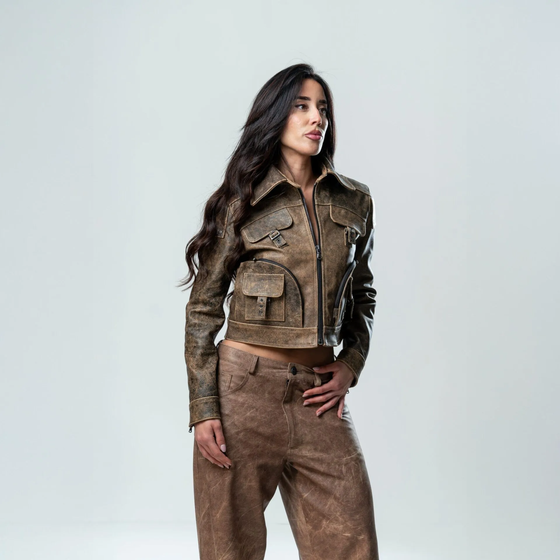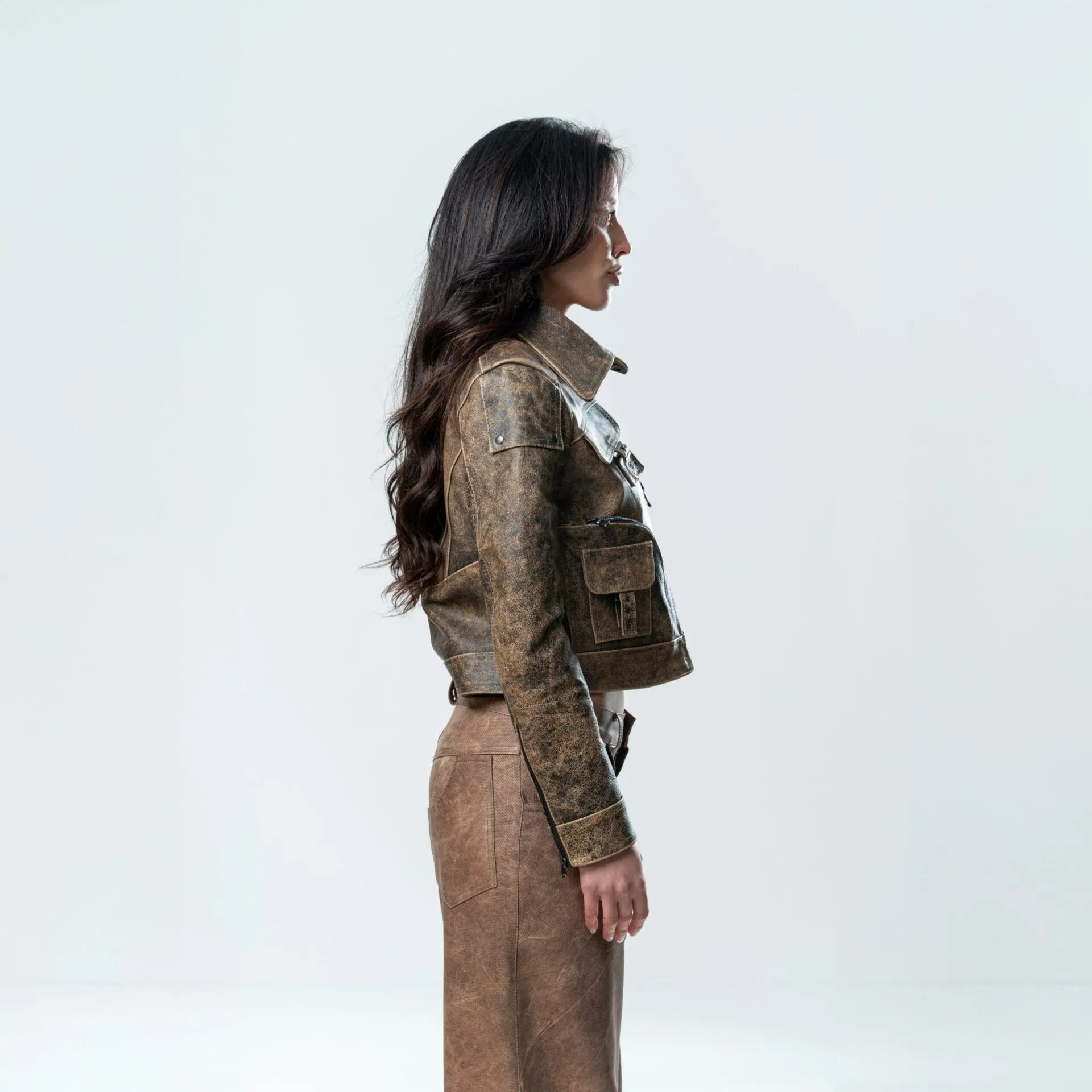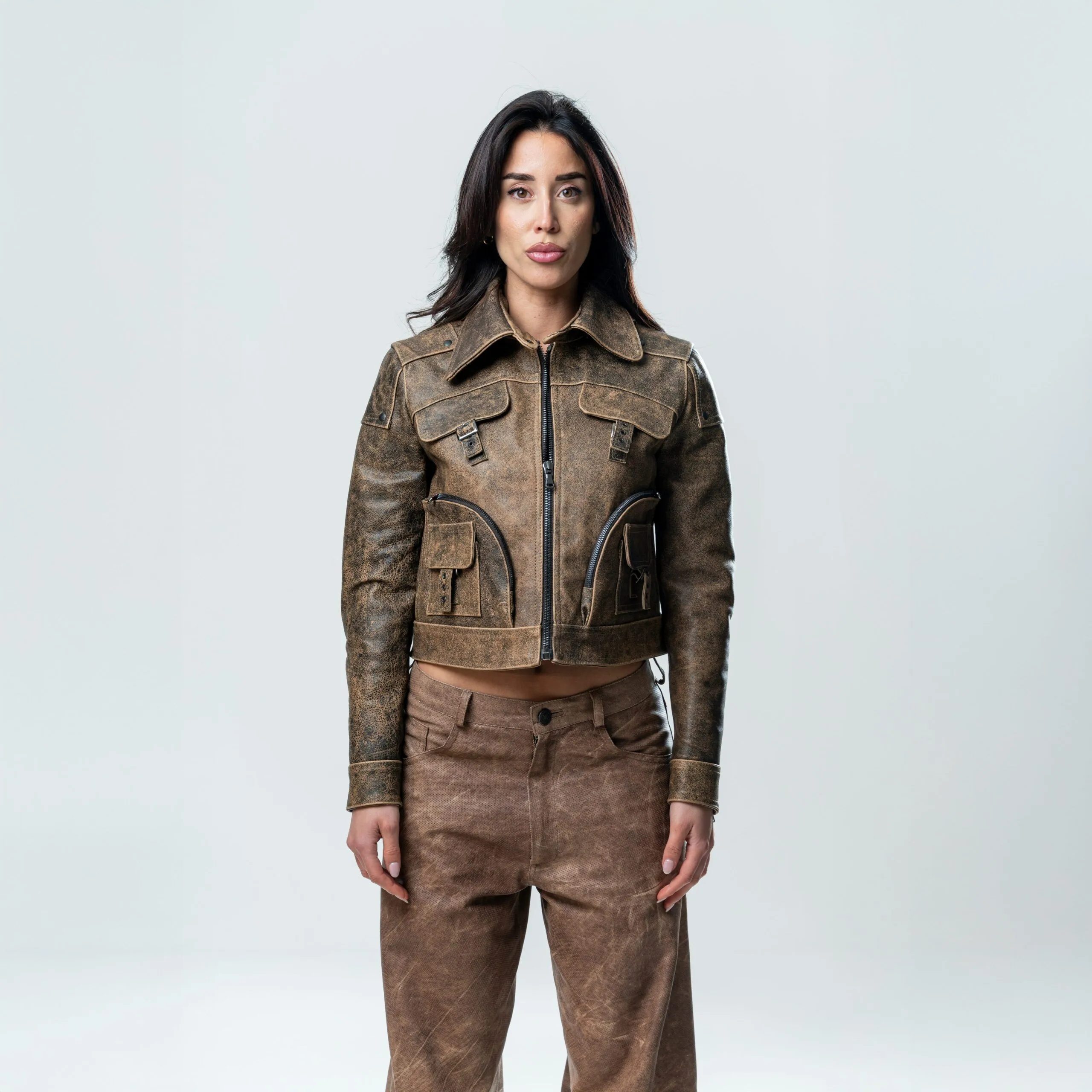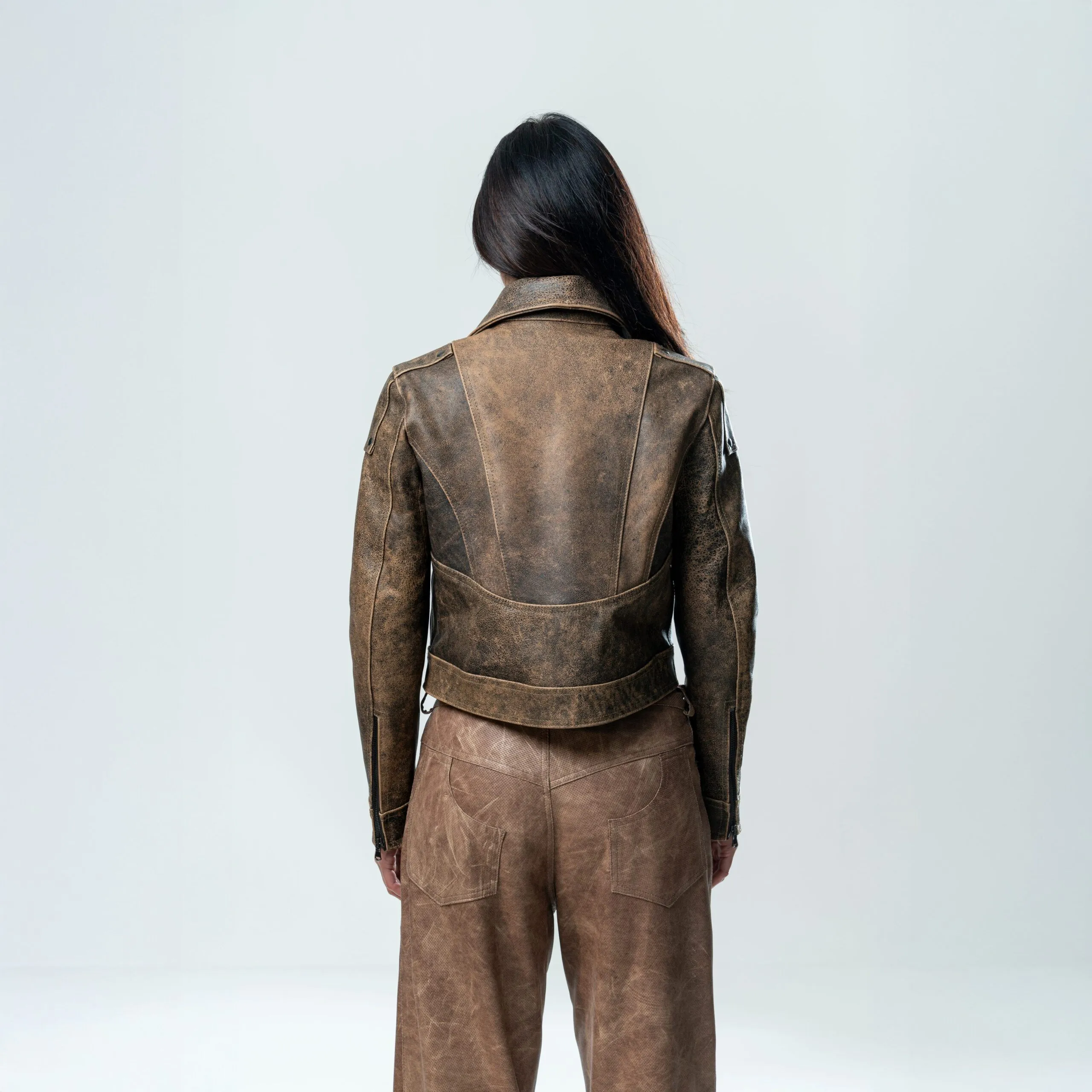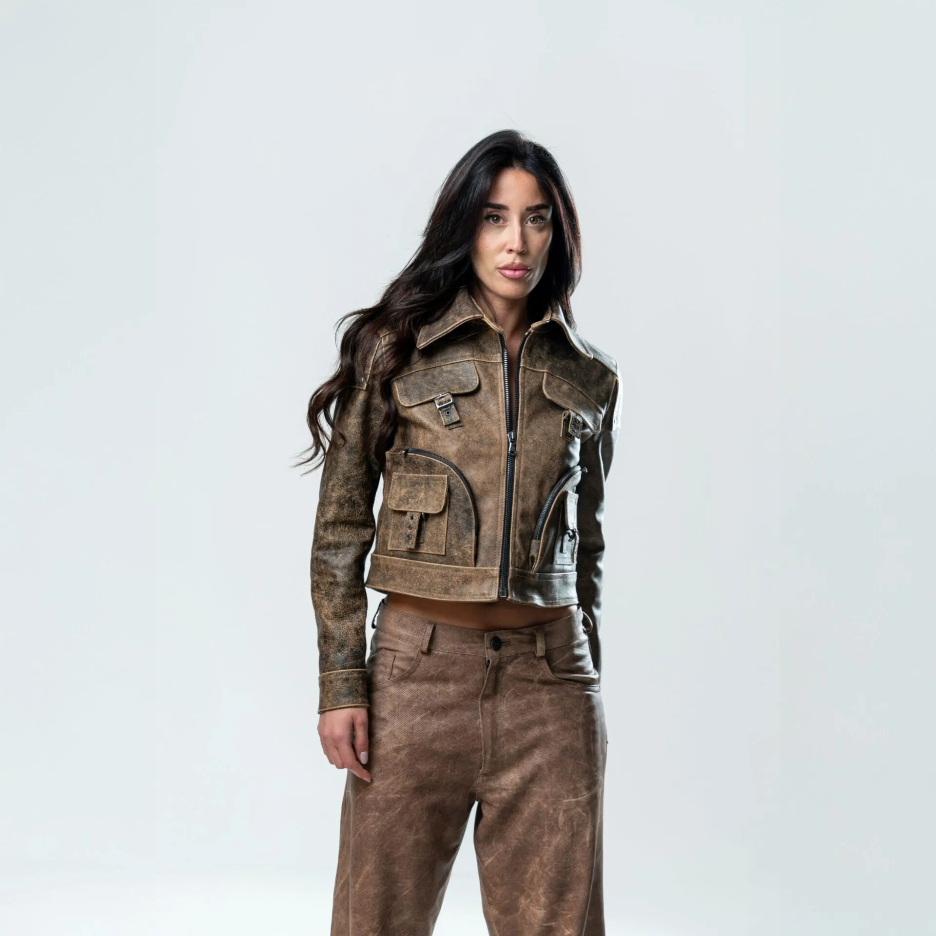 Giacca in pelle slavata a mano con con zip circolare, vestibilità over.