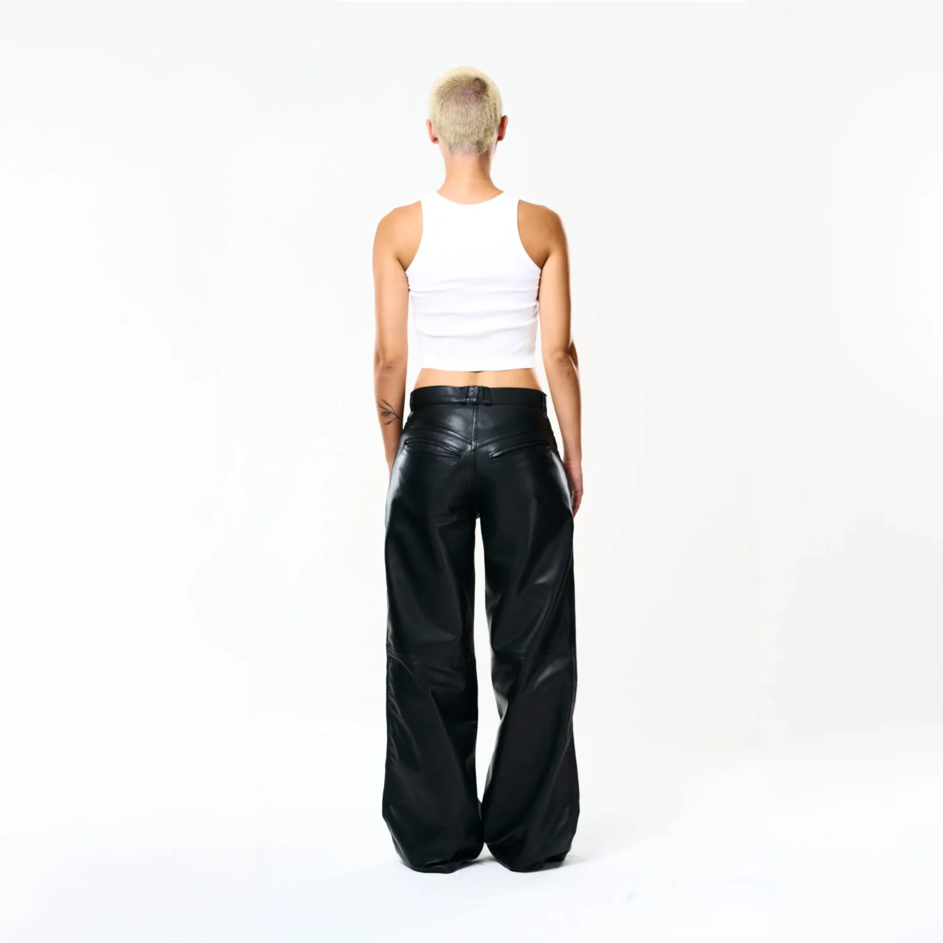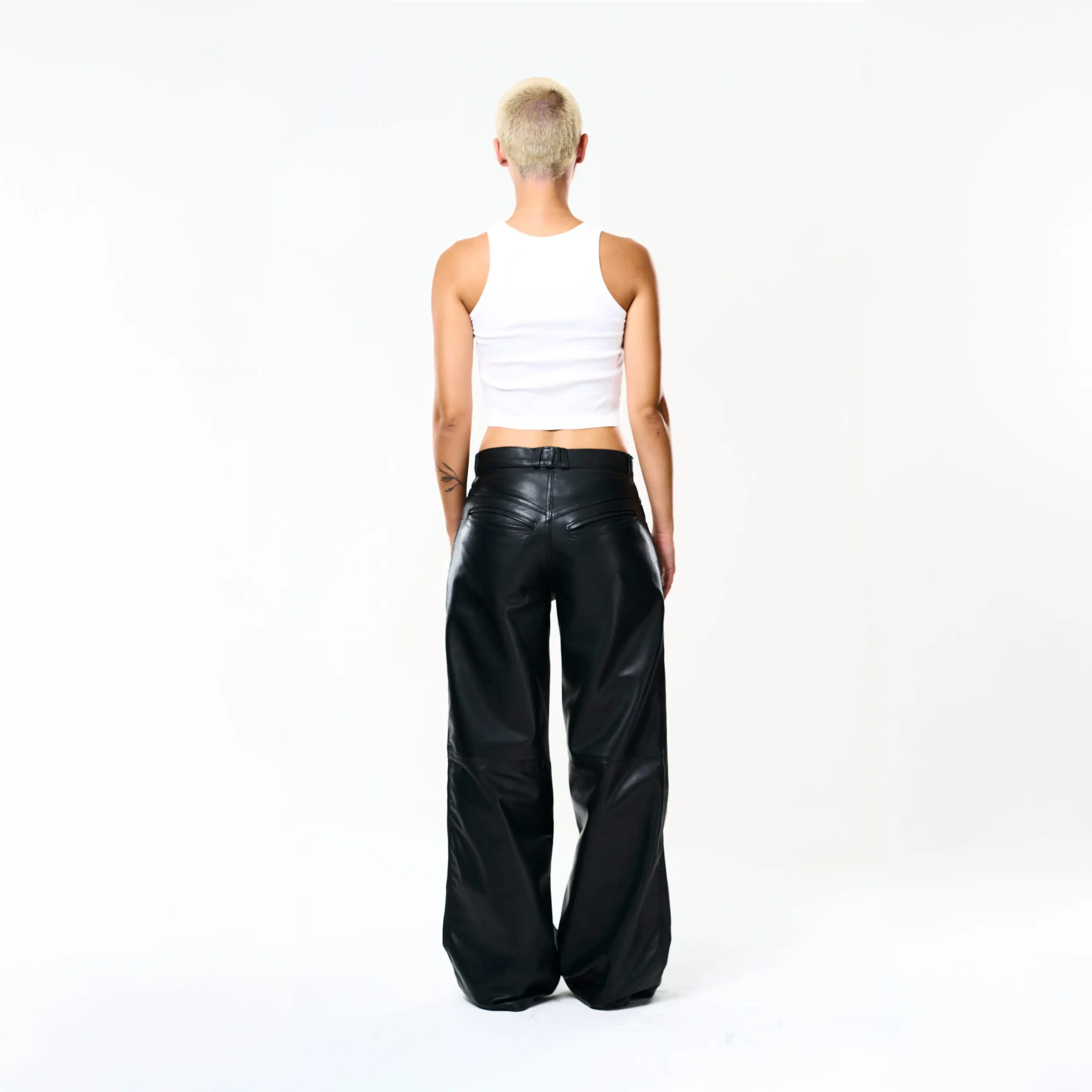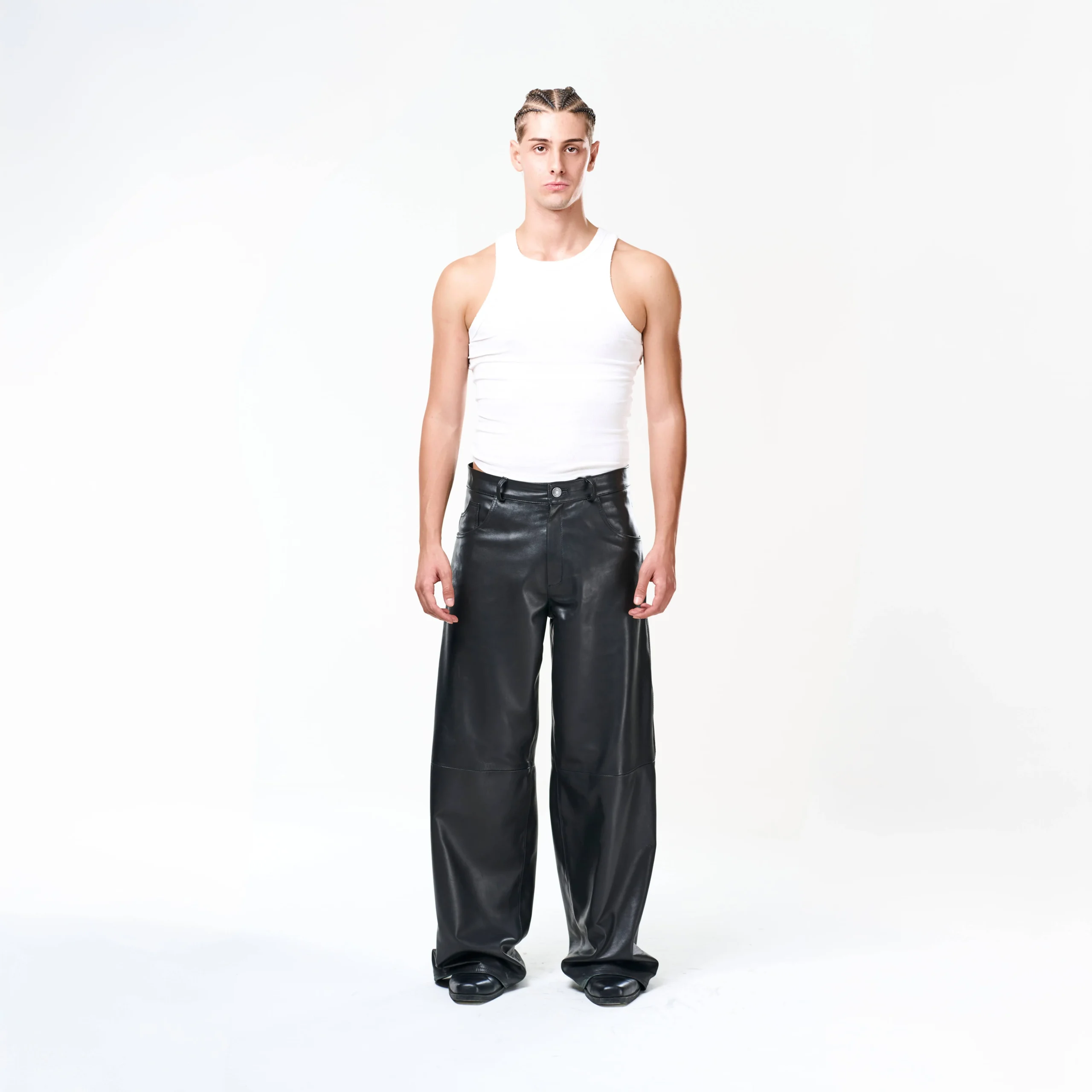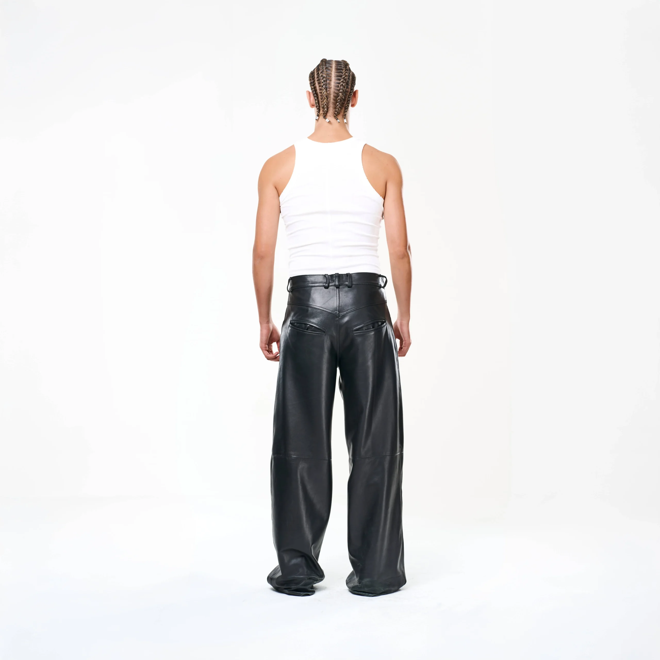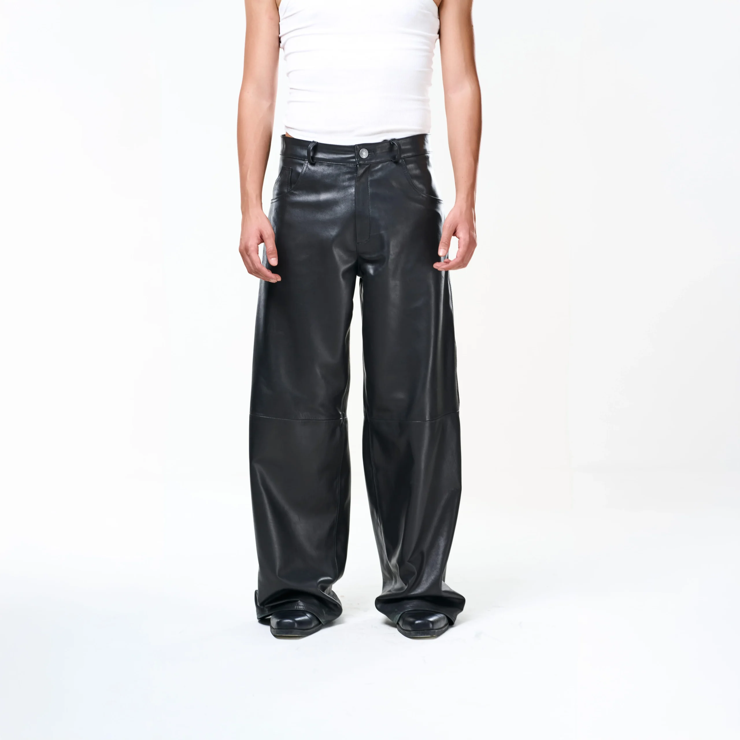 I Baggy Tailoring Black Leather Pants fondono l’estetica essenziale del minimalismo urbano con la forza materica della pelle. Realizzati in morbida pelle ovina nera, esprimono un’eleganza decisa e contemporanea, pensata per muoversi con naturalezza e carattere.