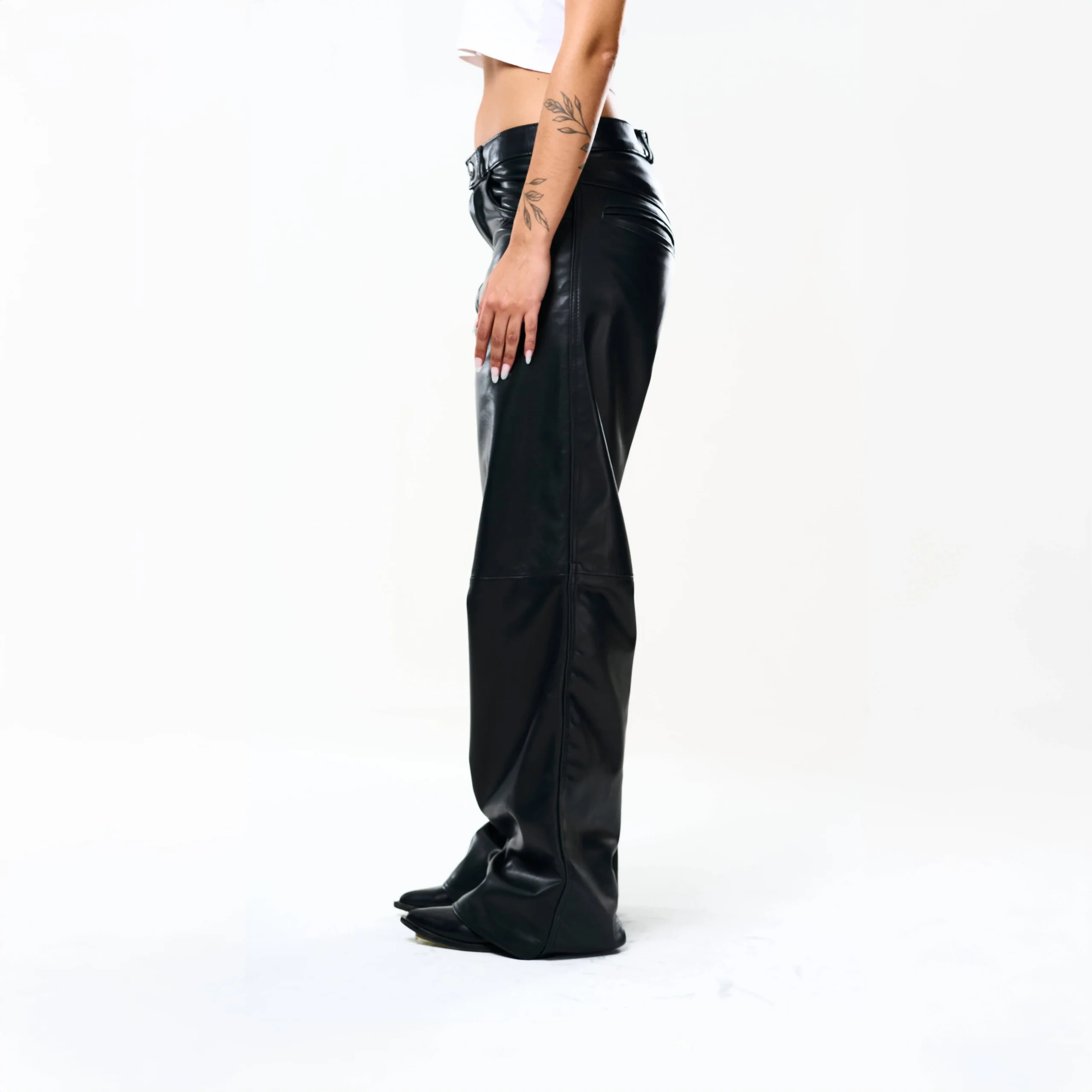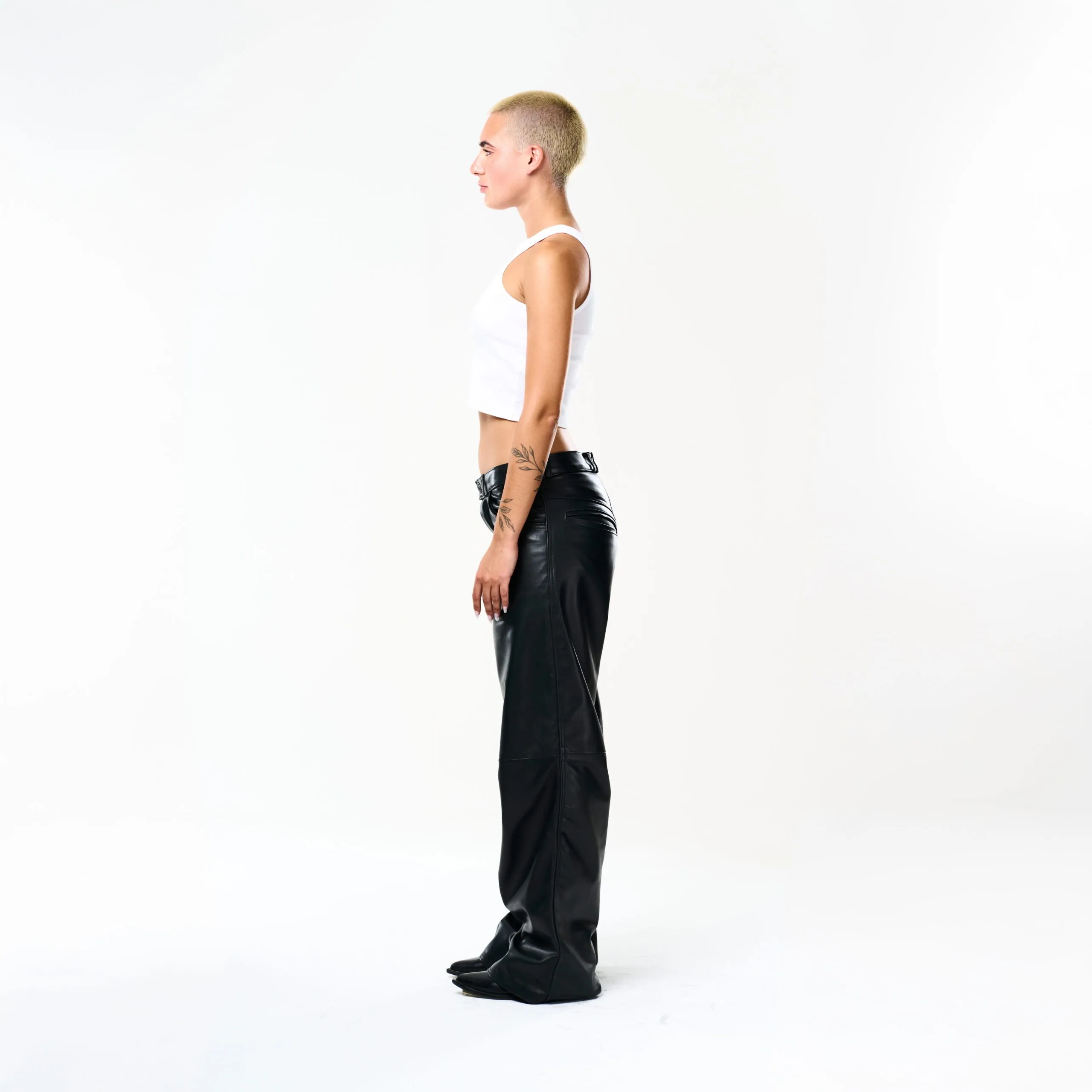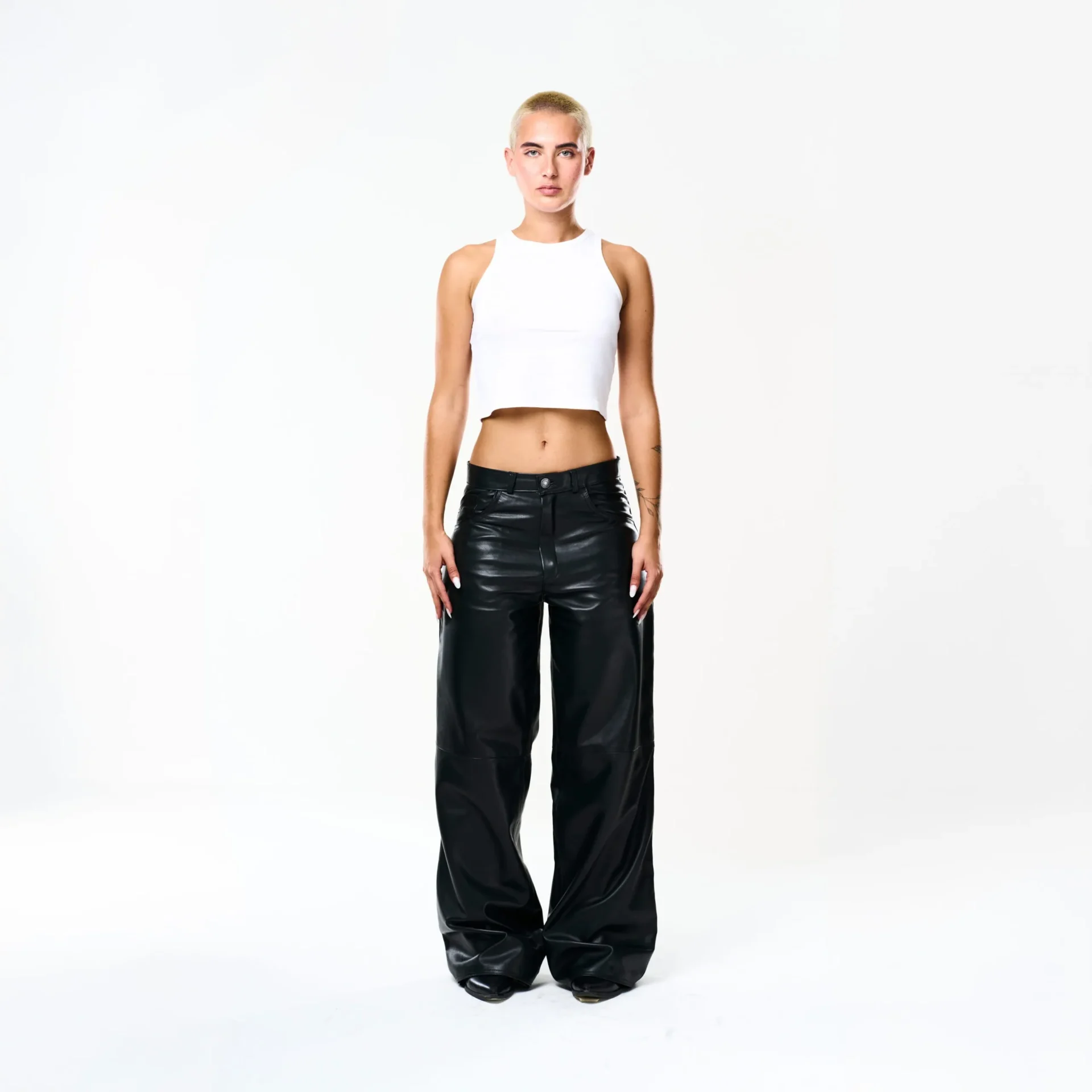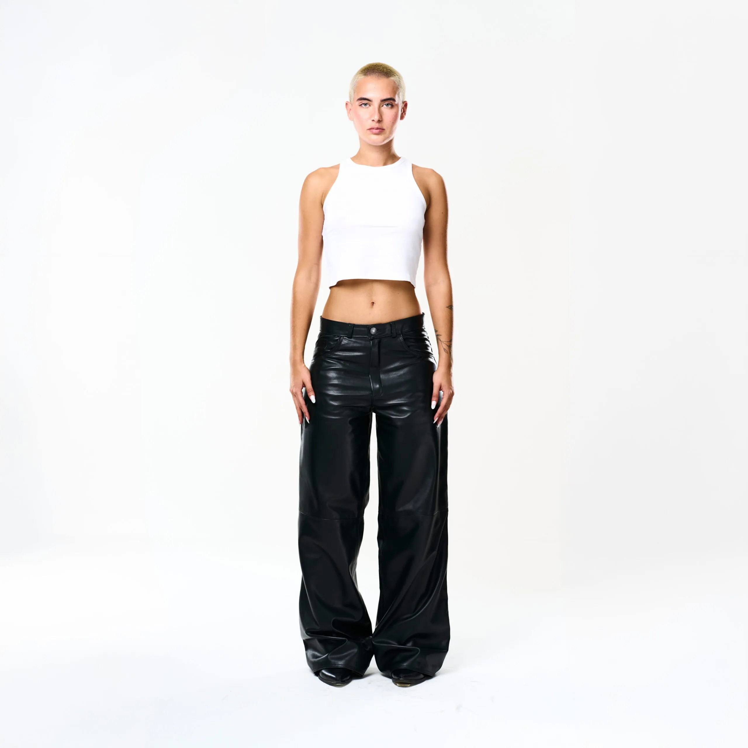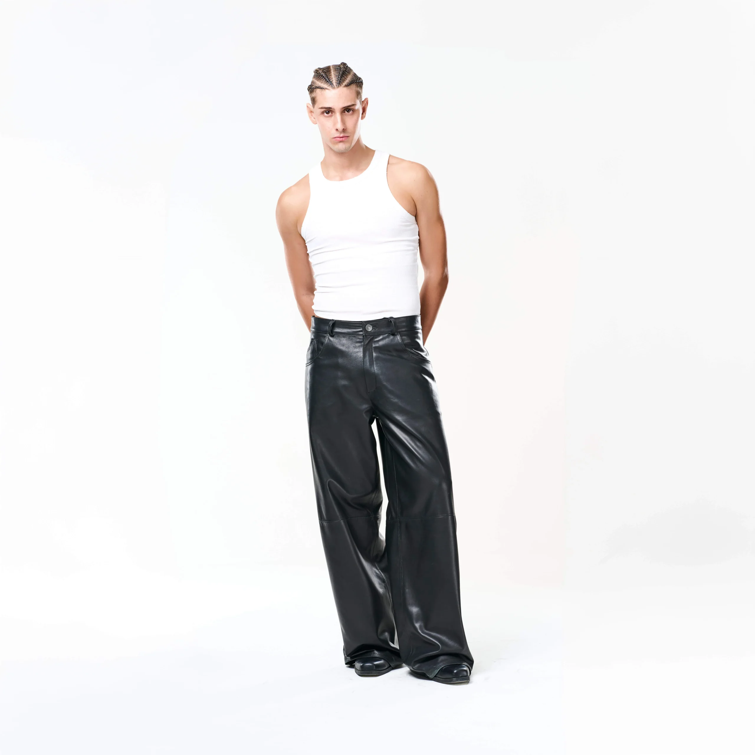 I Baggy Tailoring Black Leather Pants fondono l’estetica essenziale del minimalismo urbano con la forza materica della pelle. Realizzati in morbida pelle ovina nera, esprimono un’eleganza decisa e contemporanea, pensata per muoversi con naturalezza e carattere.