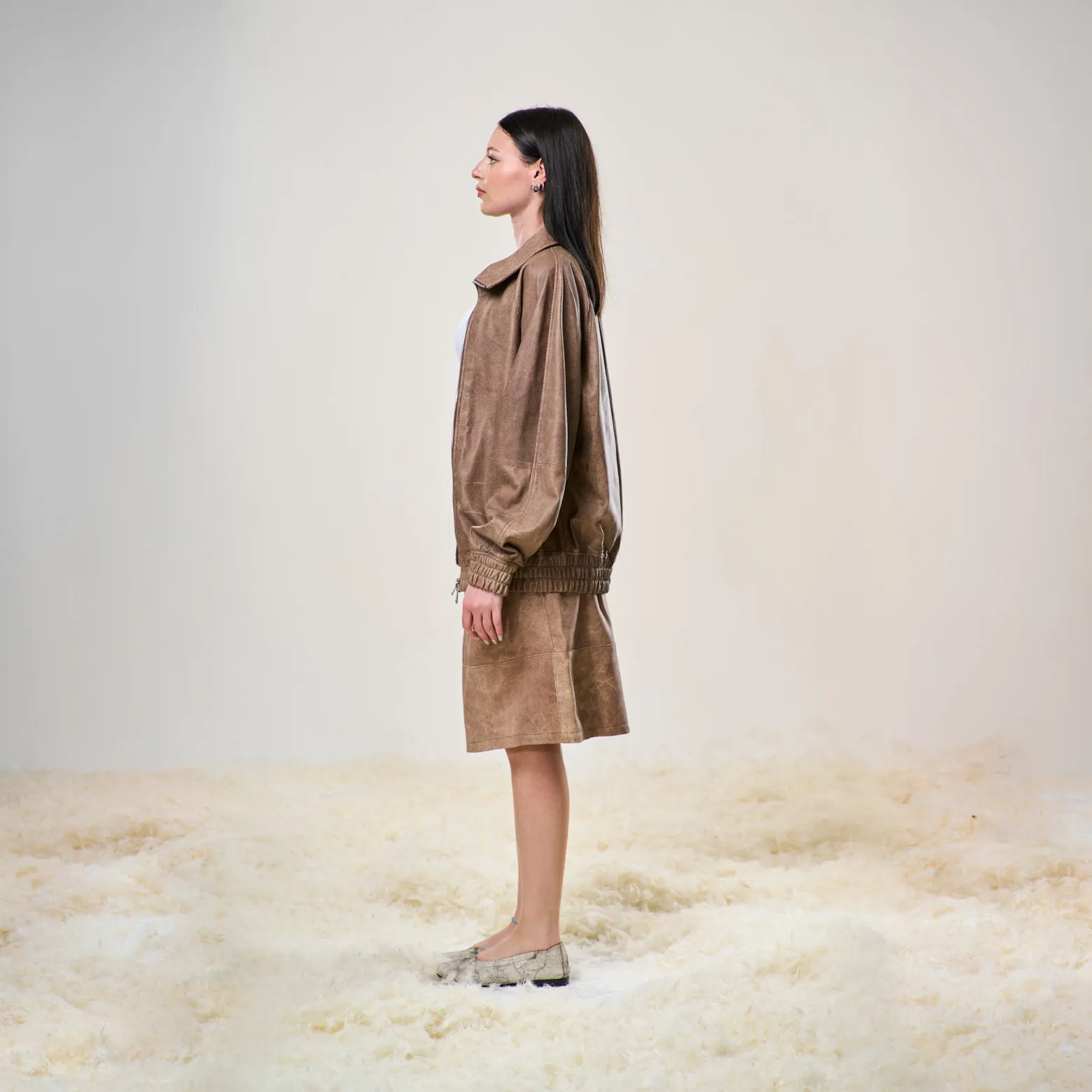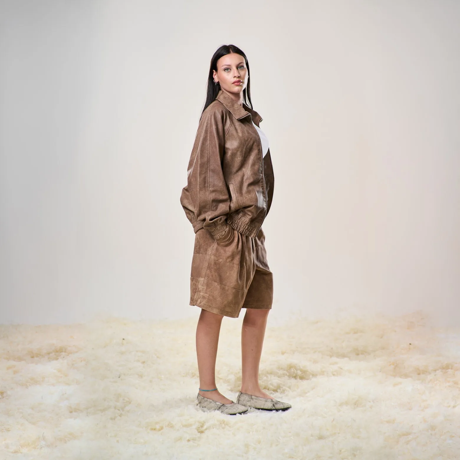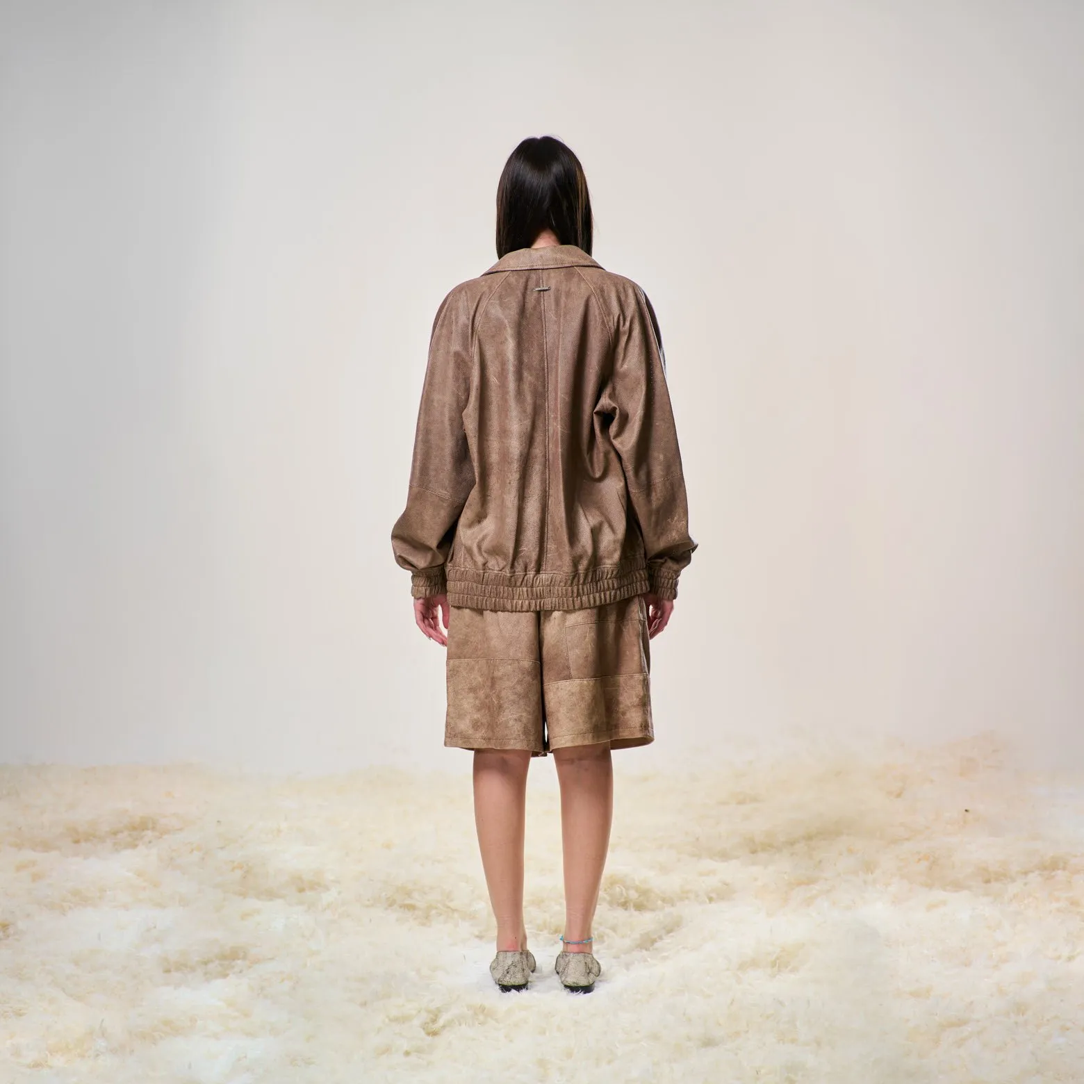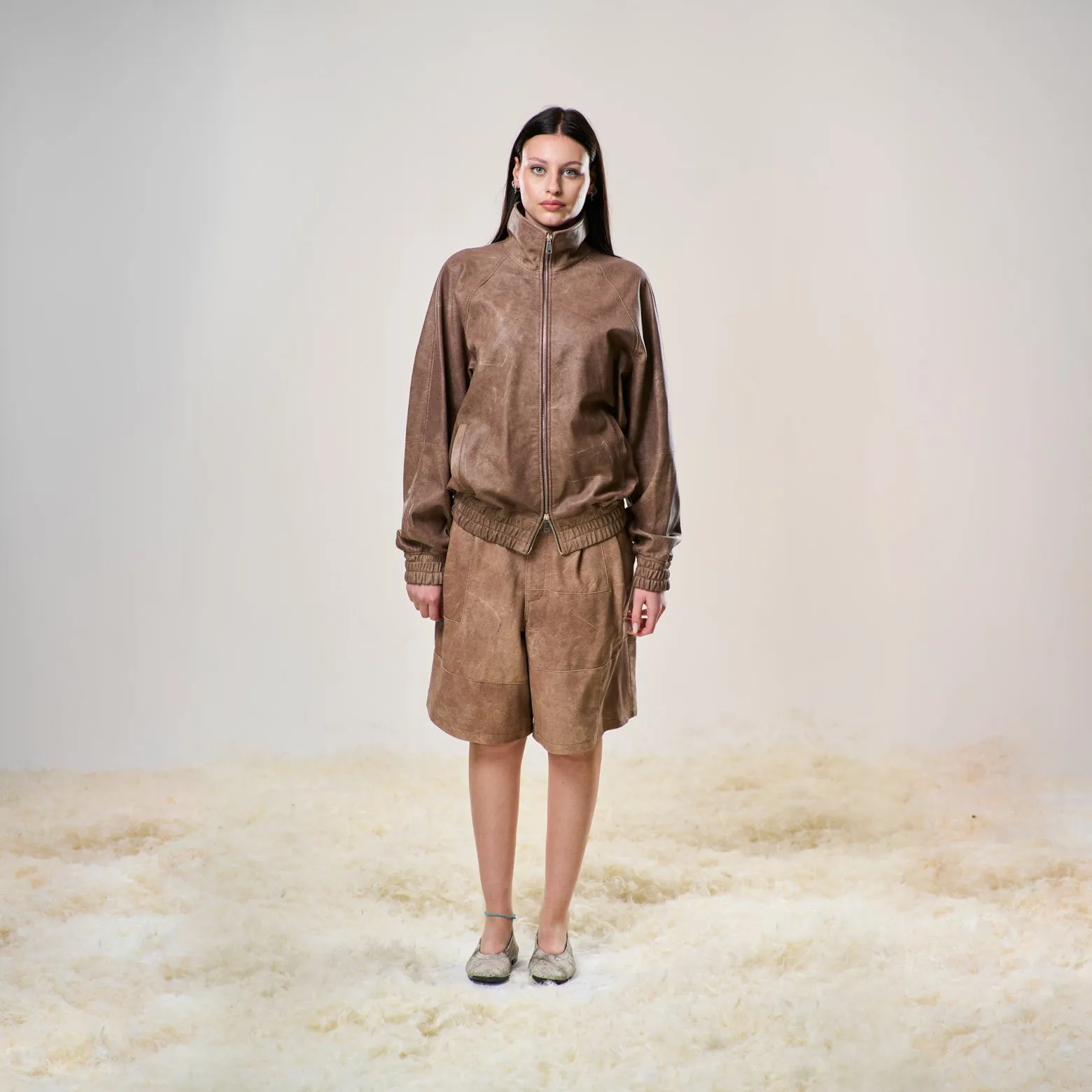 • Pelli di agnello traforate e sottoposte a lavaggio, ultra leggere: rendono ogni pezzo unico.