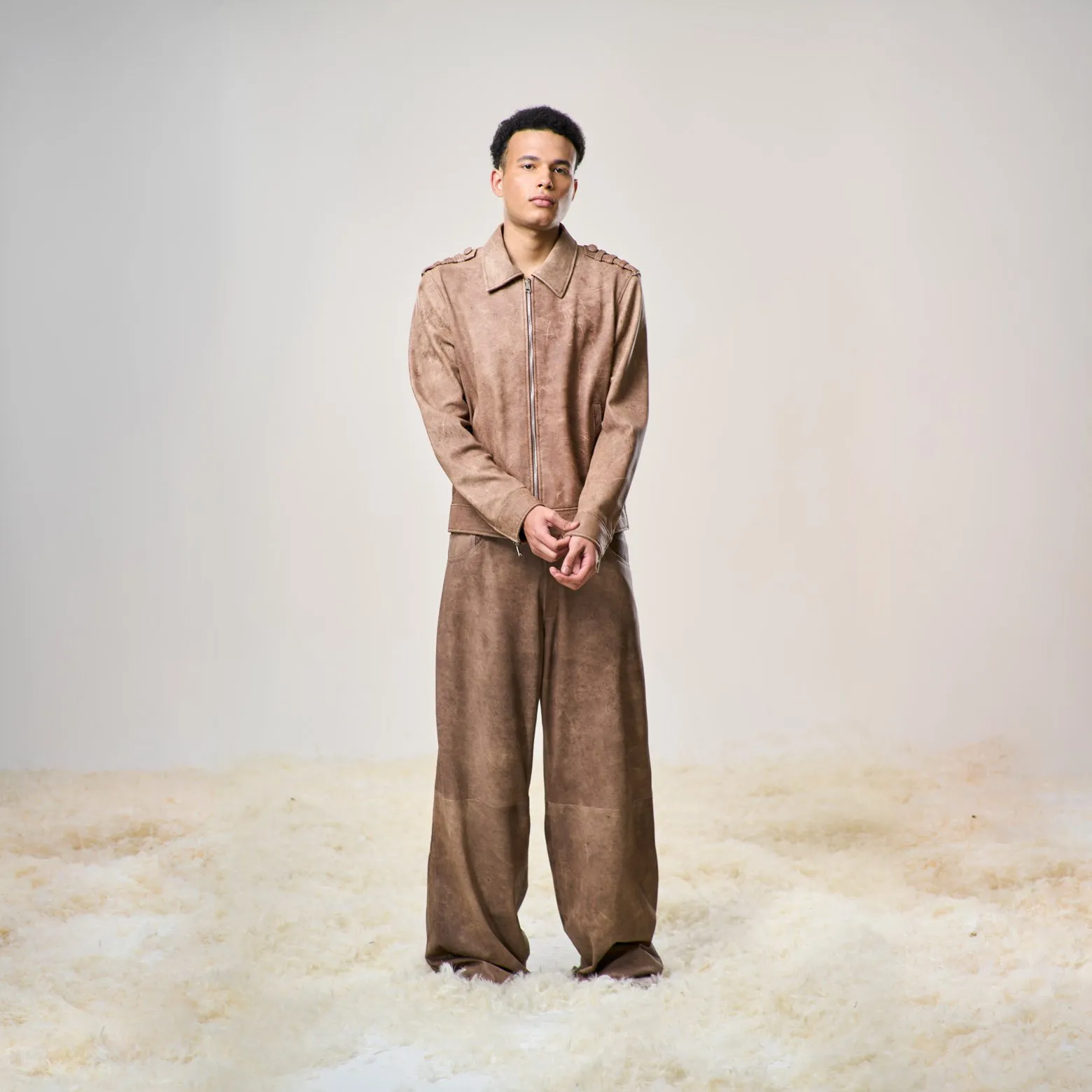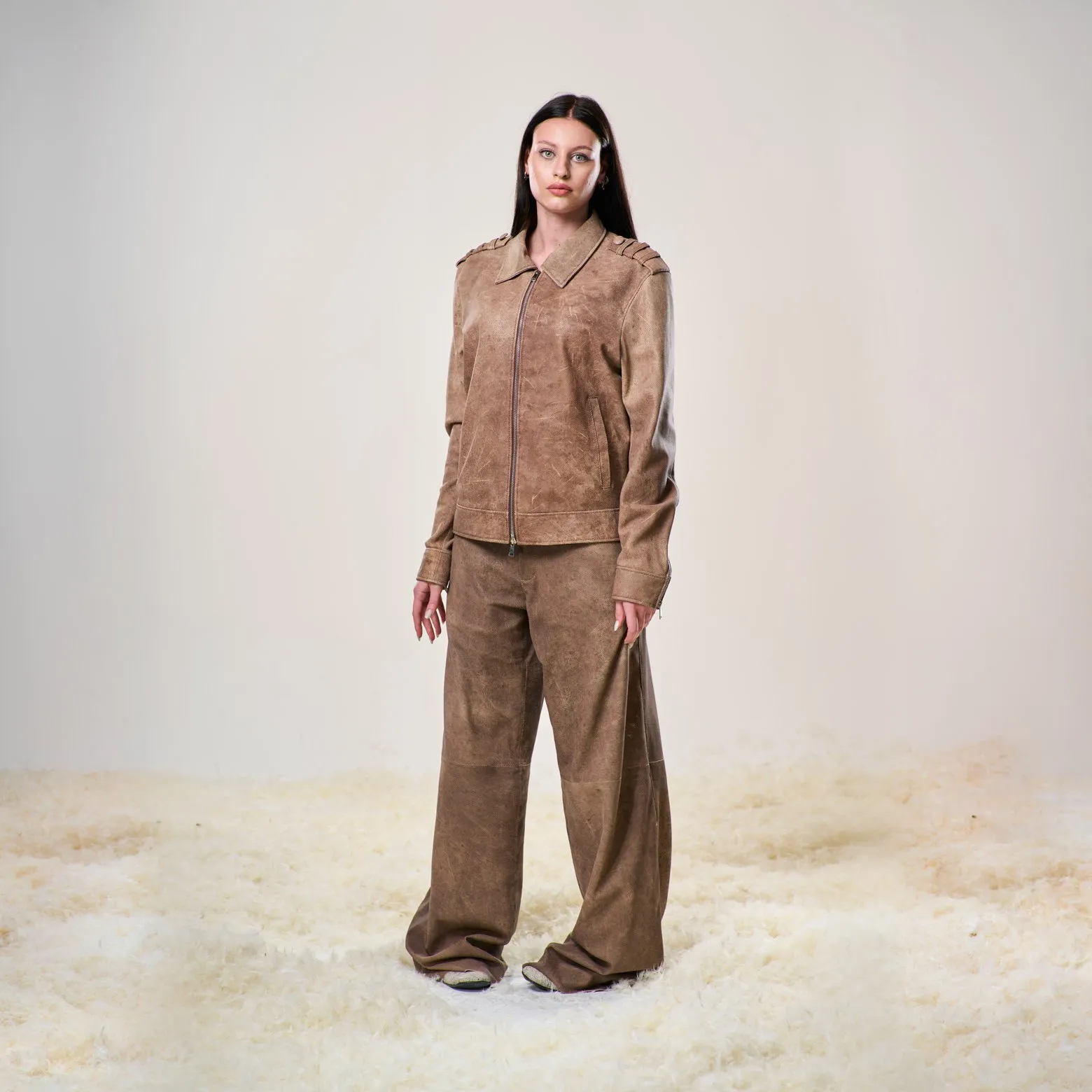 • Pelli di agnello traforate e sottoposte a lavaggio, ultra leggere: rendono ogni pezzo unico.