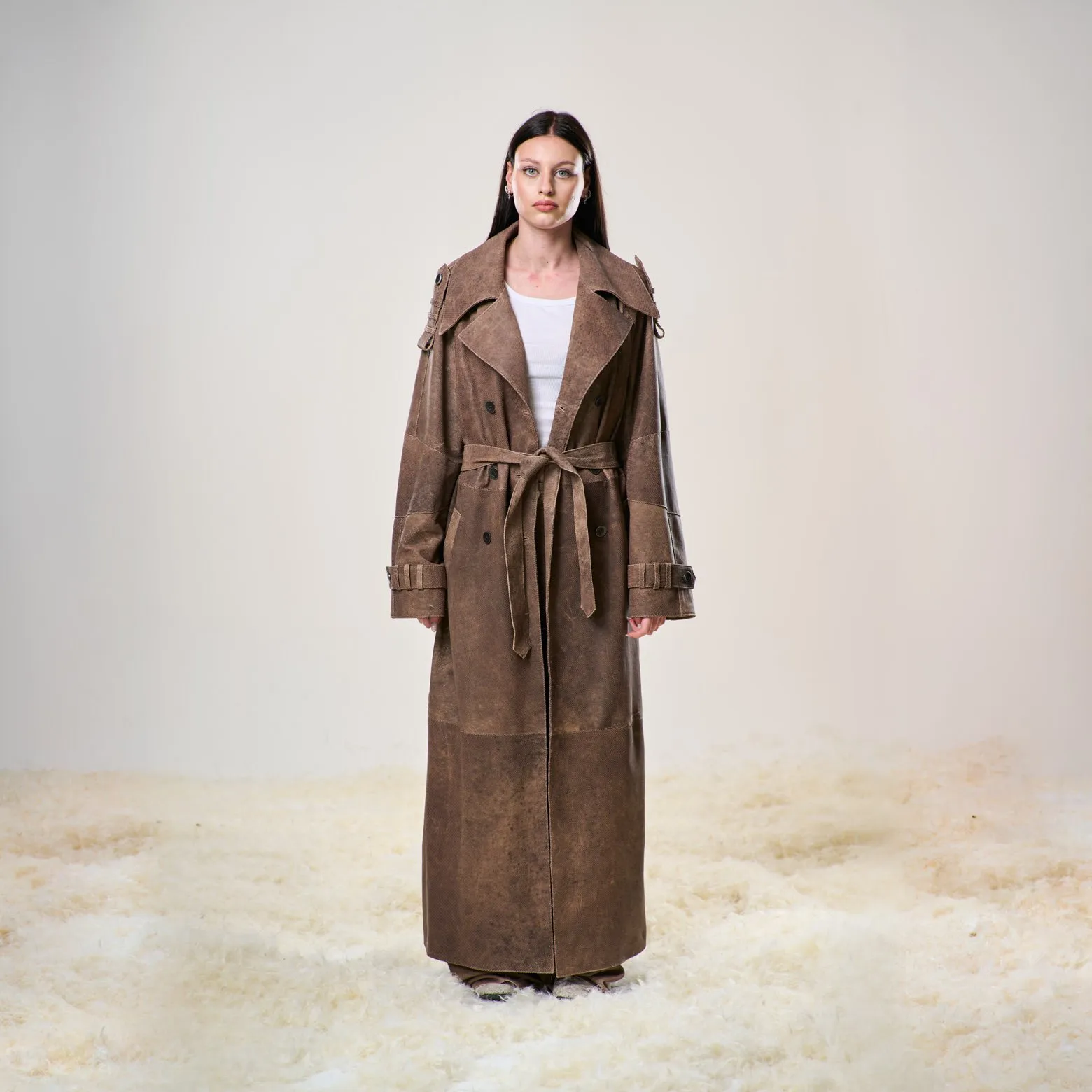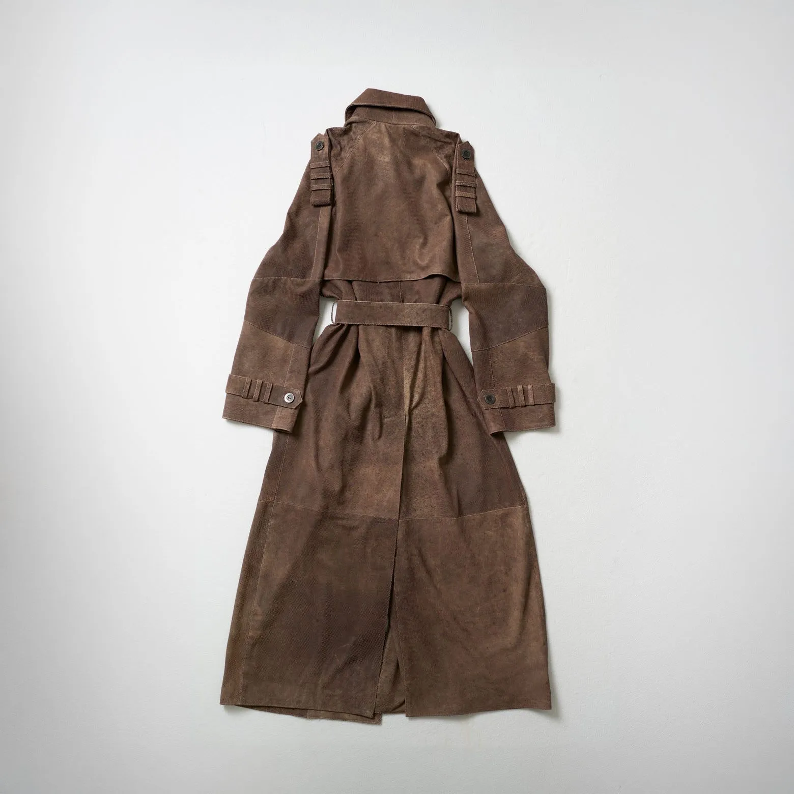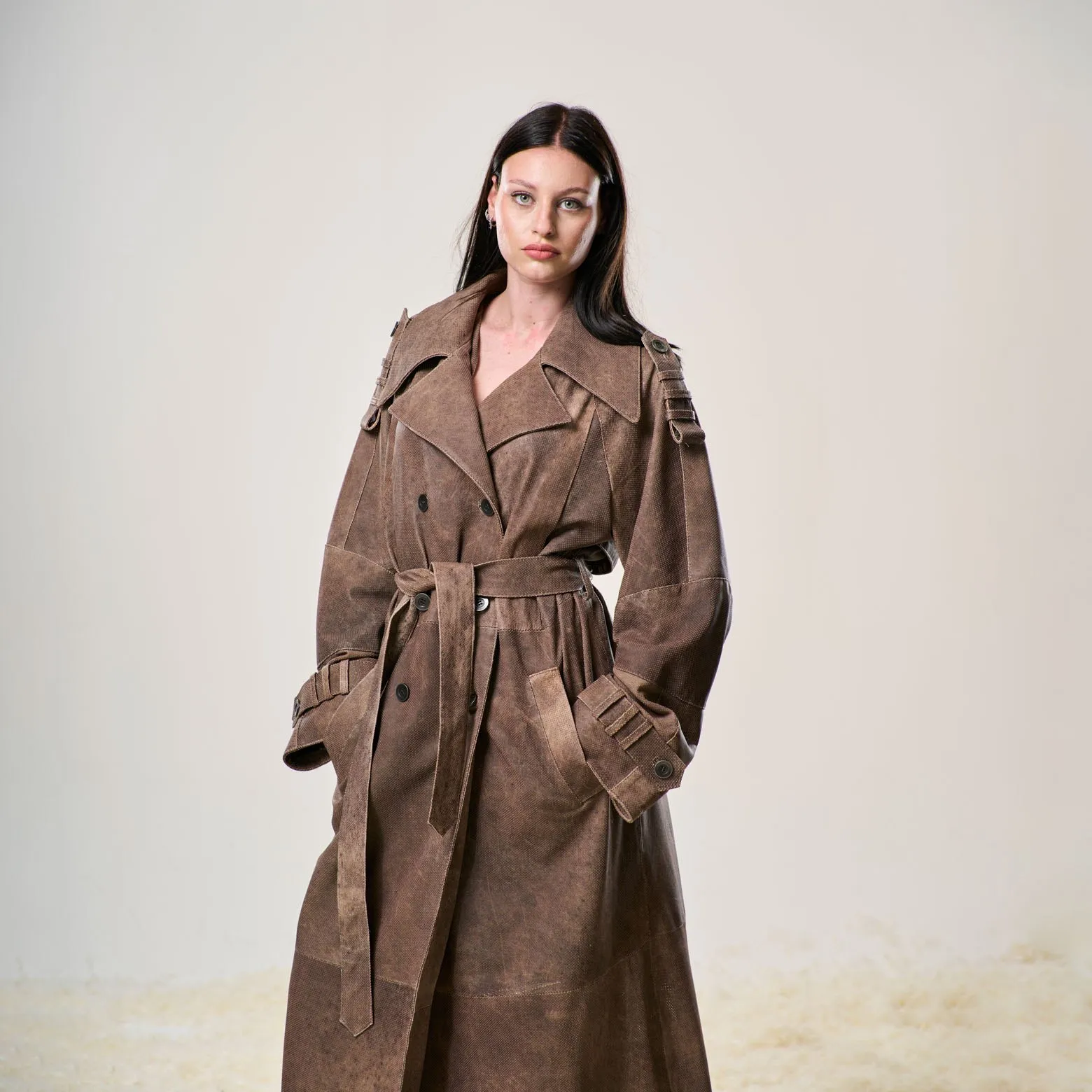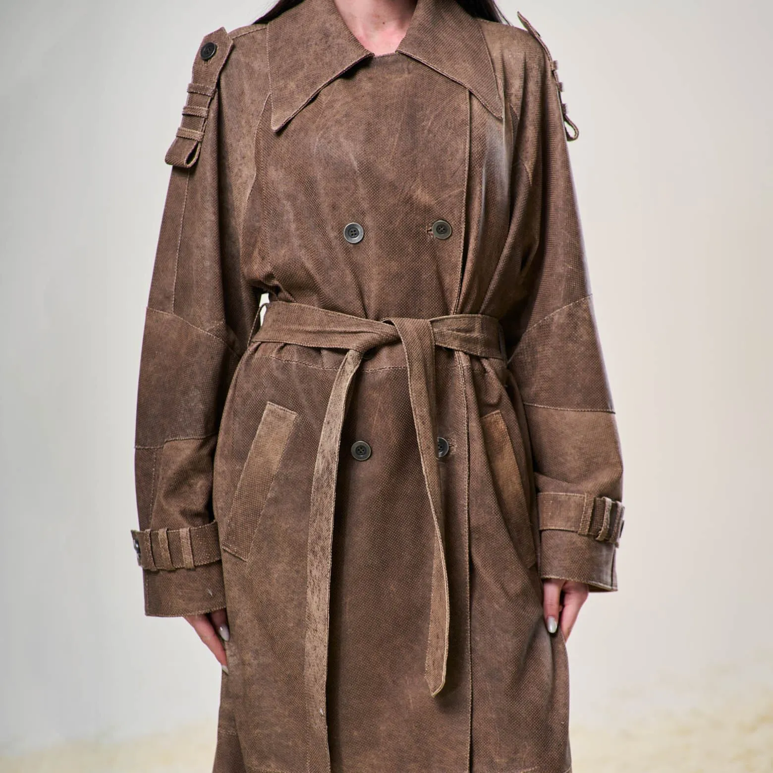 Trench in pelle di agnello traforata ultraleggera, doppio petto con cintura in vita.