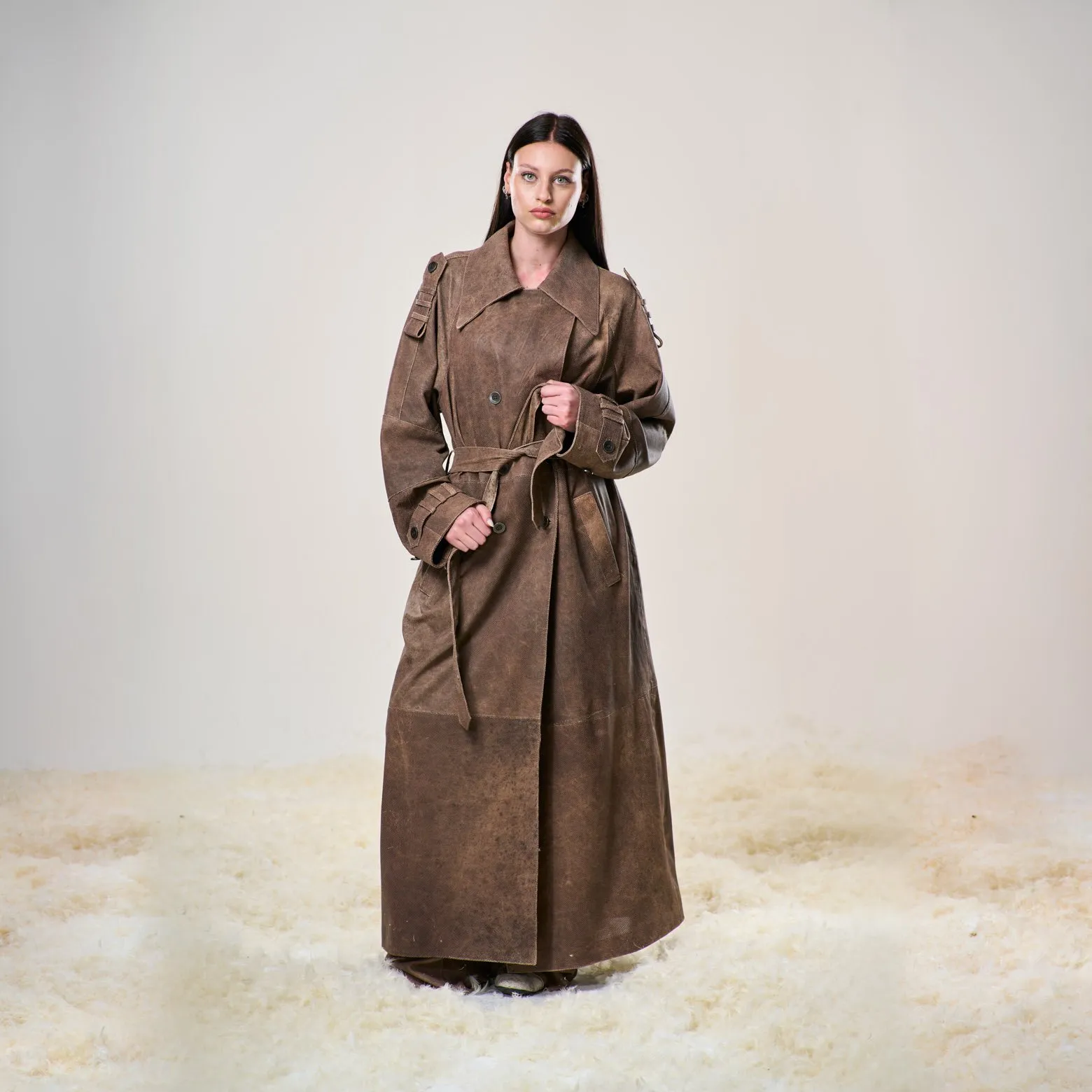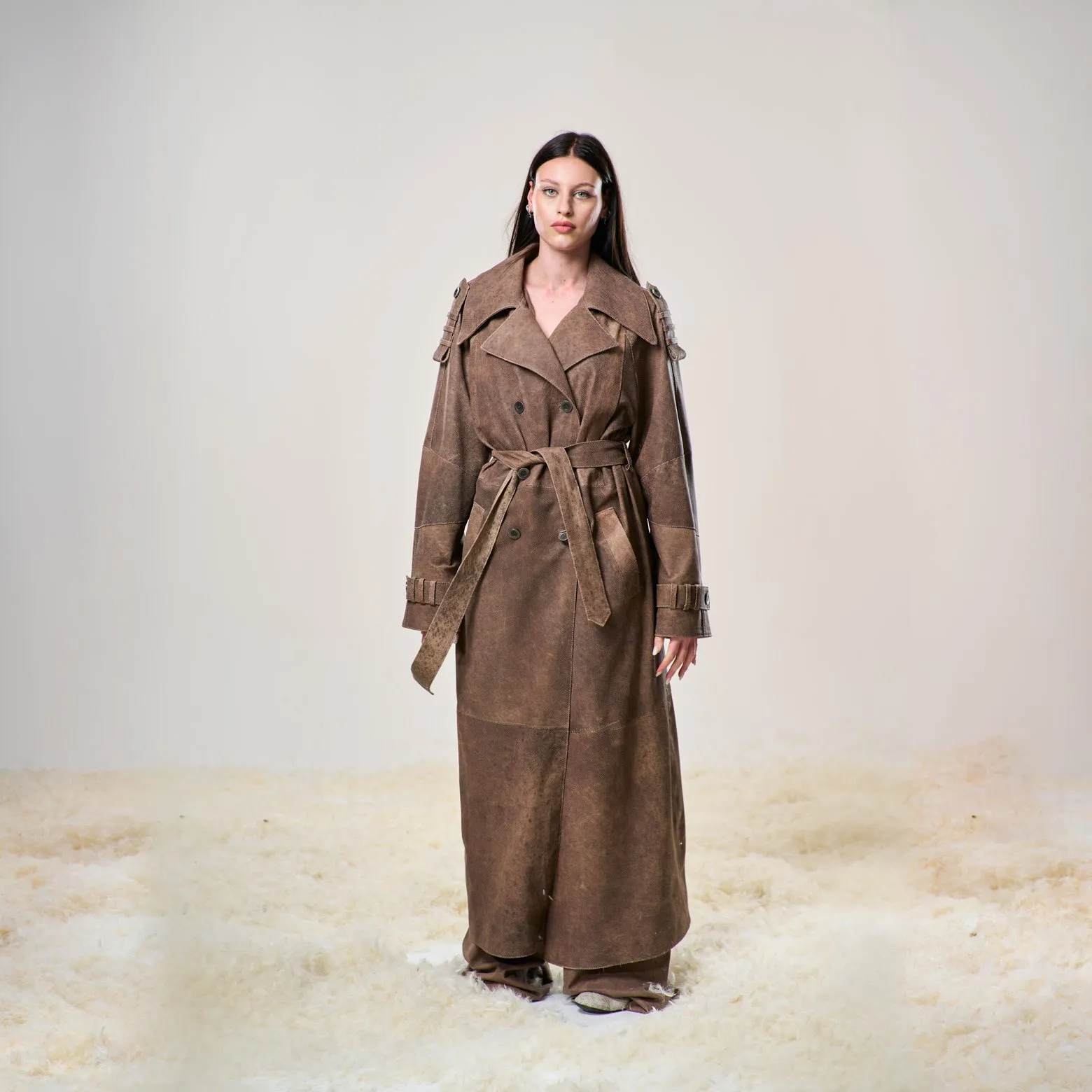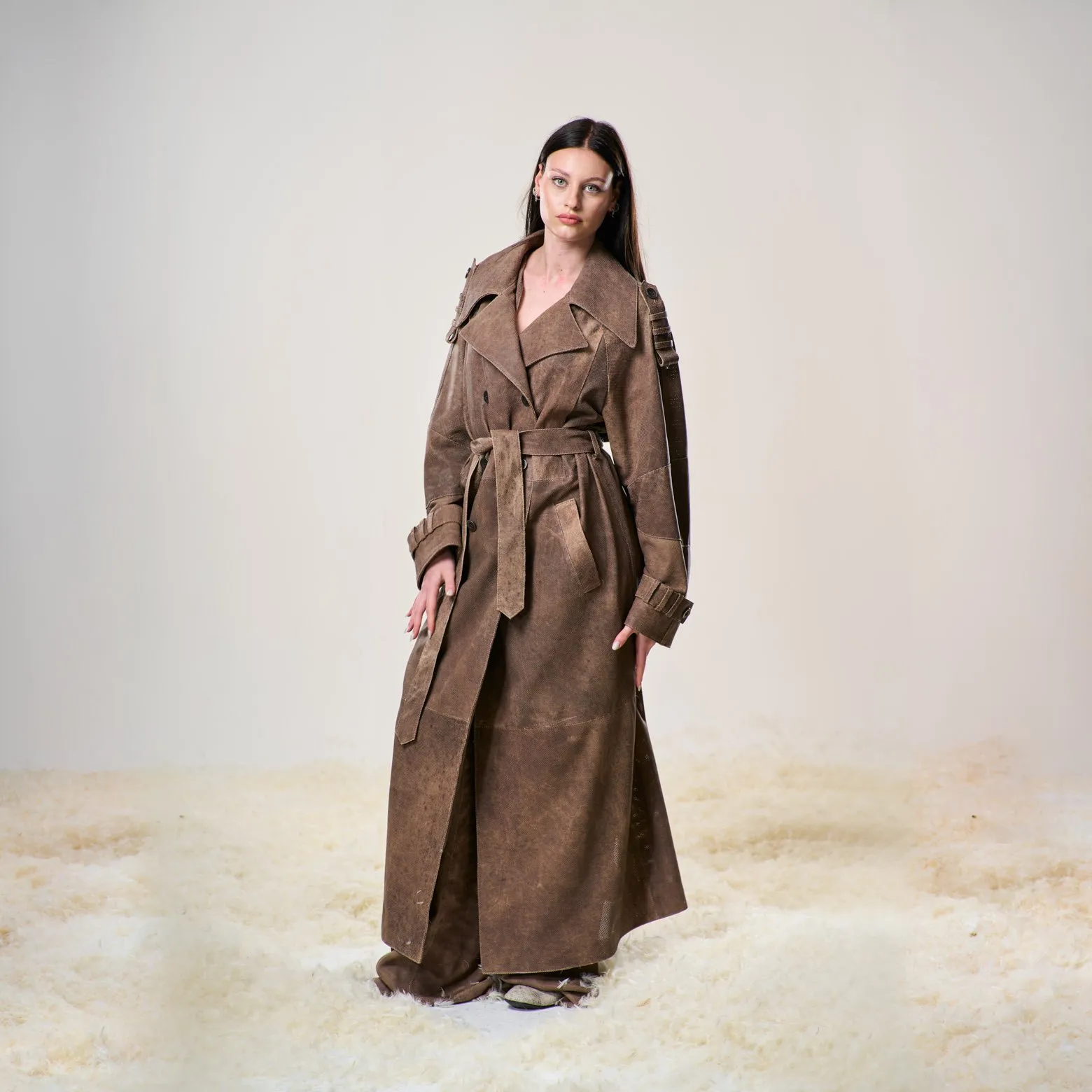 Trench in pelle di agnello traforata ultraleggera, doppio petto con cintura in vita.