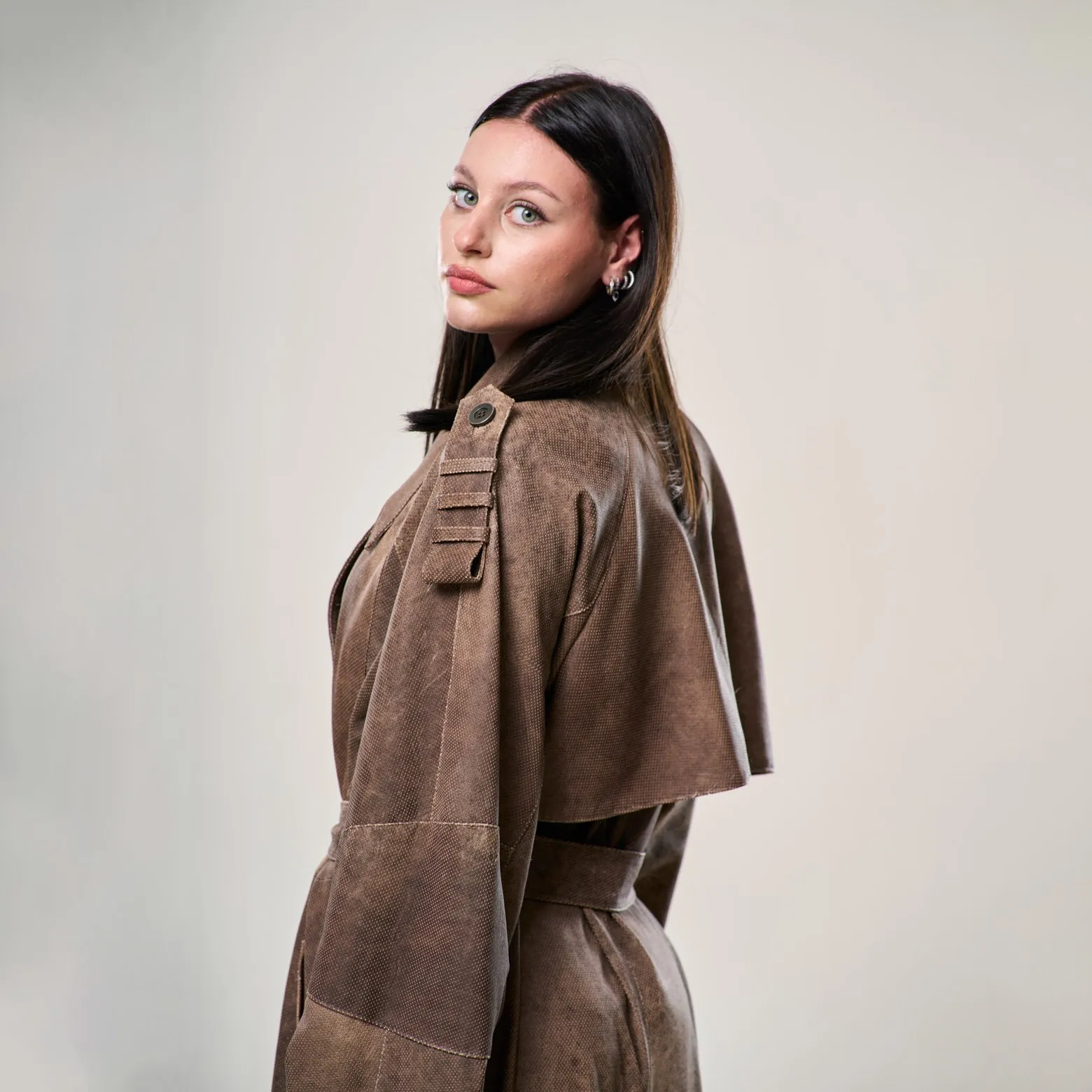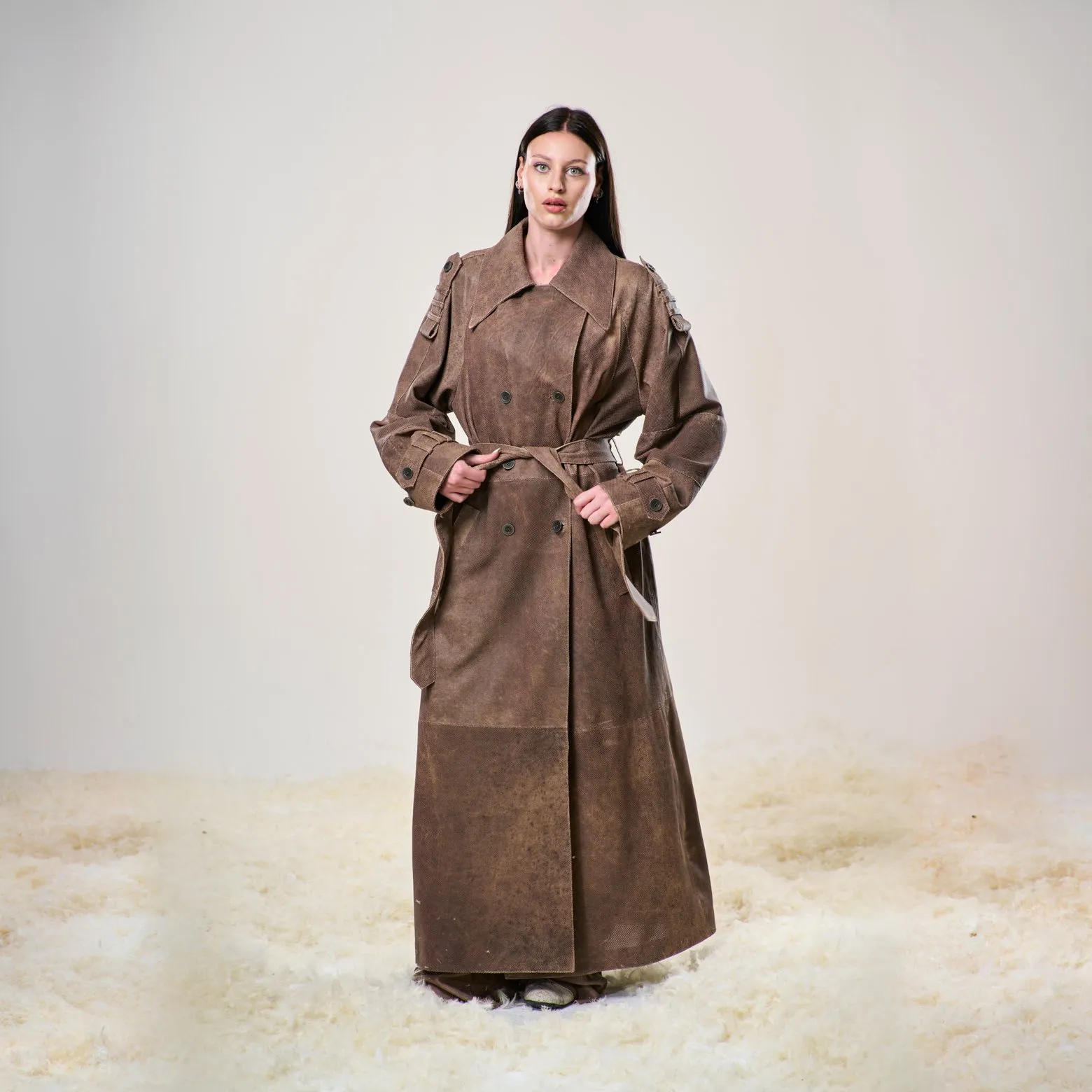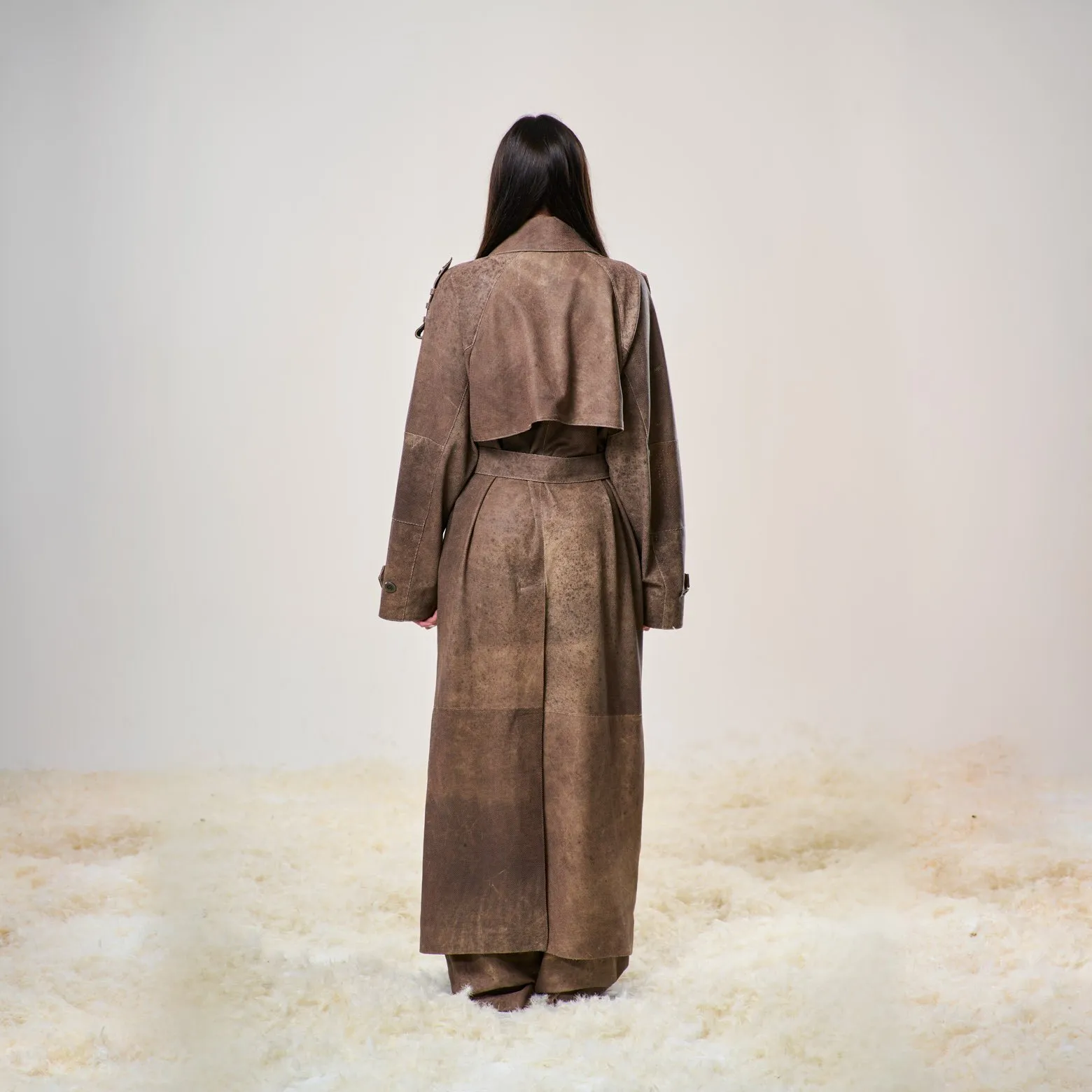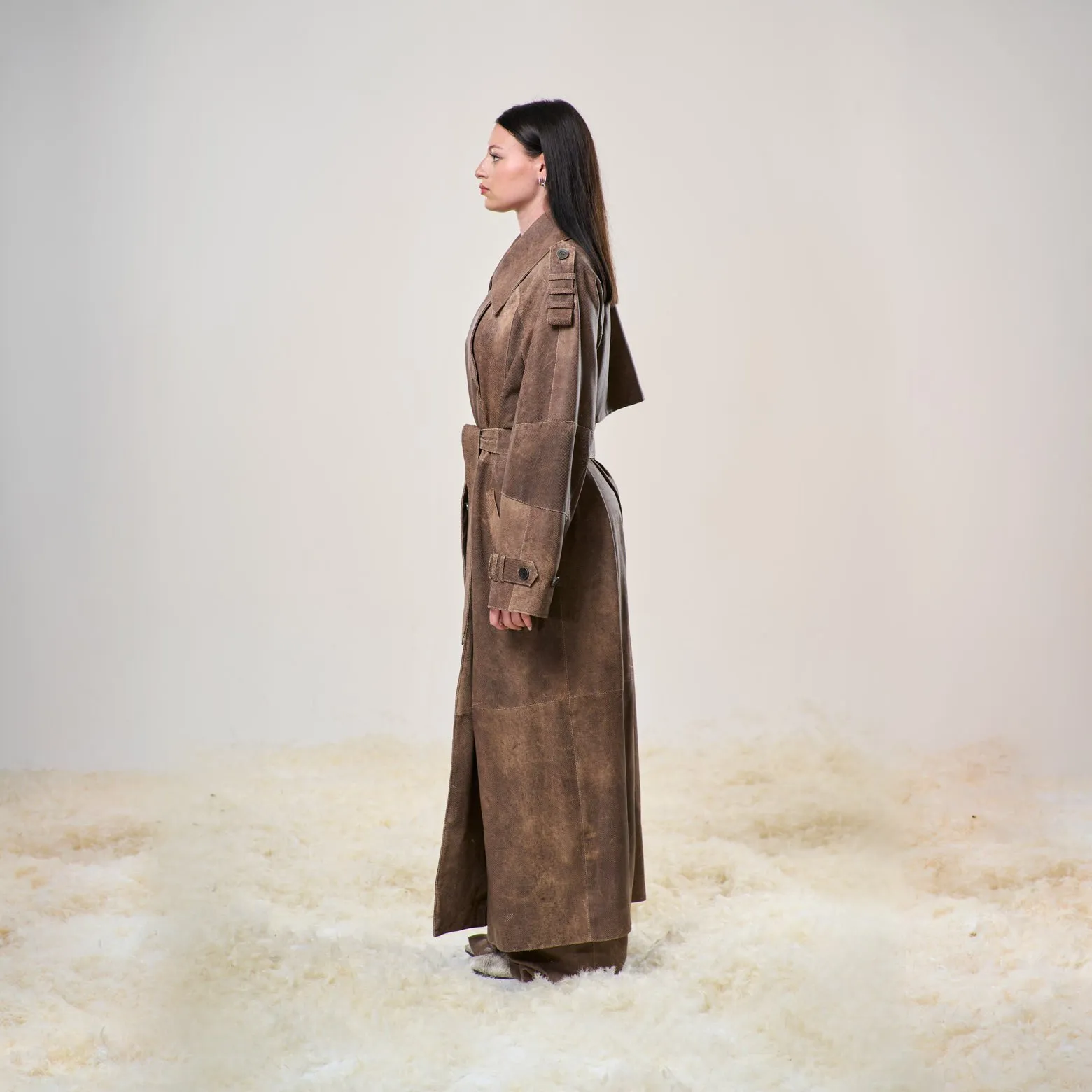 Trench in pelle di agnello traforata ultraleggera, doppio petto con cintura in vita.